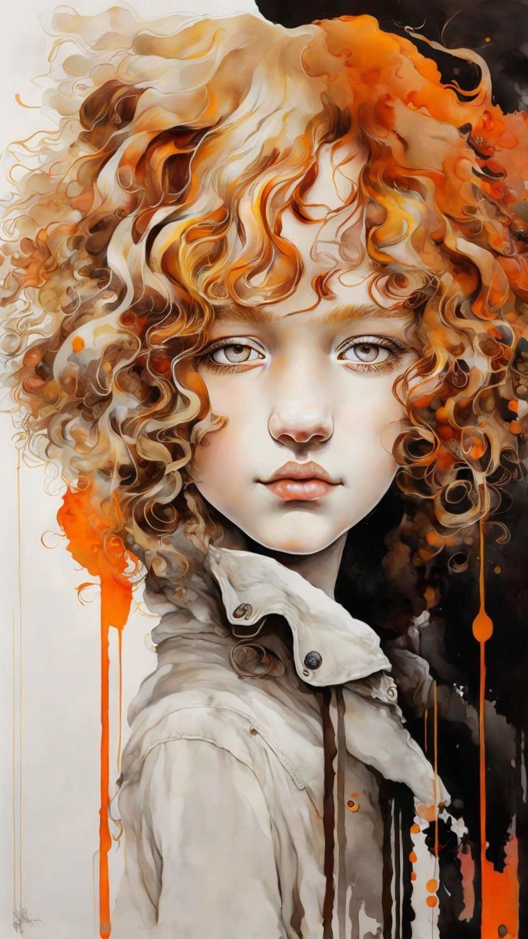 Beautiful girl with big brown eyes, blond curly hair, umber, orange, and yellow colors, by Ralph Steadman, by Gerald Scarfe,bygobi"Create a mesmerizing digital illustration featuring a beautiful girl with big brown eyes and blond curly hair, drawing inspiration from the artistic styles of Ralph Steadman and Gerald Scarfe. Explore the transition between two art styles within the piece, blending elements of creative fantasy and vivid abstraction with surrealism. Utilize umber, orange, and yellow colors to evoke warmth and vibrancy, while maintaining ultra-detailed high resolution.The artwork should depict the girl in a dynamic, centered pose, with perfect anatomy and intricate details, reminiscent of a watercolor painting. Set against a vintage Japanese-inspired background, infuse elements of fantasy and Art Nouveau, drawing inspiration from artists such as Annigoni, Egon Schiele, and Botticelli. Incorporate complementary colors and hyper-detailed William Morris patterns to enhance the richness of the scene.