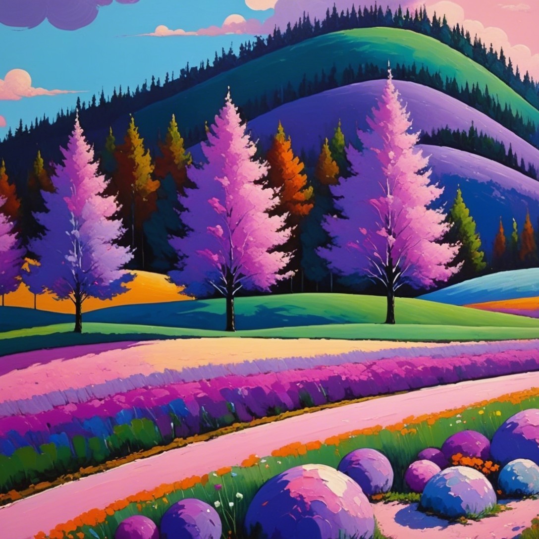 A vibrant landscape features rolling hills in shades of purple and green, adorned with blossoming pink trees and colorful flower patches, creating a serene and cheerful atmosphere.