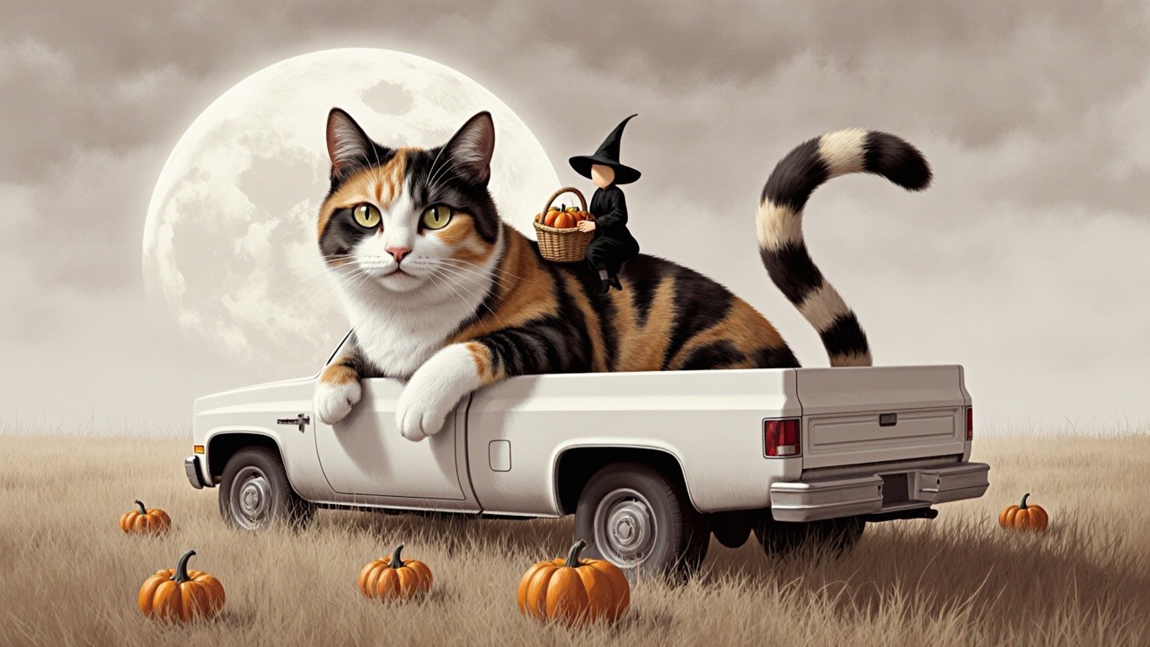 A whimsical scene featuring a giant orange cat lounging on a vintage truck, while a small girl in a witch costume sits beside it. The setting includes pumpkins and a full moon in a cloudy sky.
