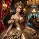A woman in an elegant, elaborate gown stands in a luxurious, chandelier-lit room. Rich decor surrounds her, while a couple converses in the background, adding to the opulent atmosphere.