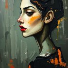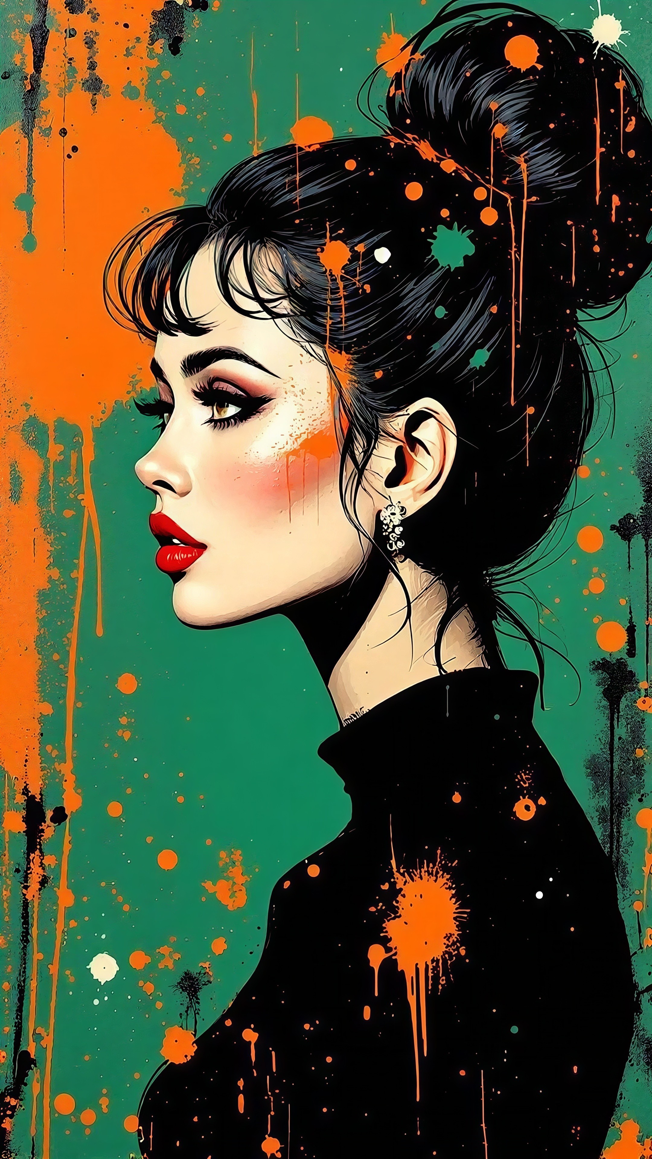 A vibrant portrait in an anime art style, depicting a woman with black hair styled in a messy bun. Her side profile is visible, showcasing her fair skin, accentuated with red blush and red lipstick. Her eyes are detailed with long eyelashes and eyeshadow.