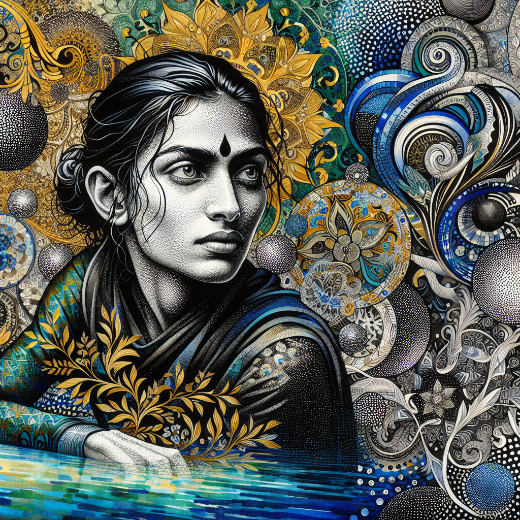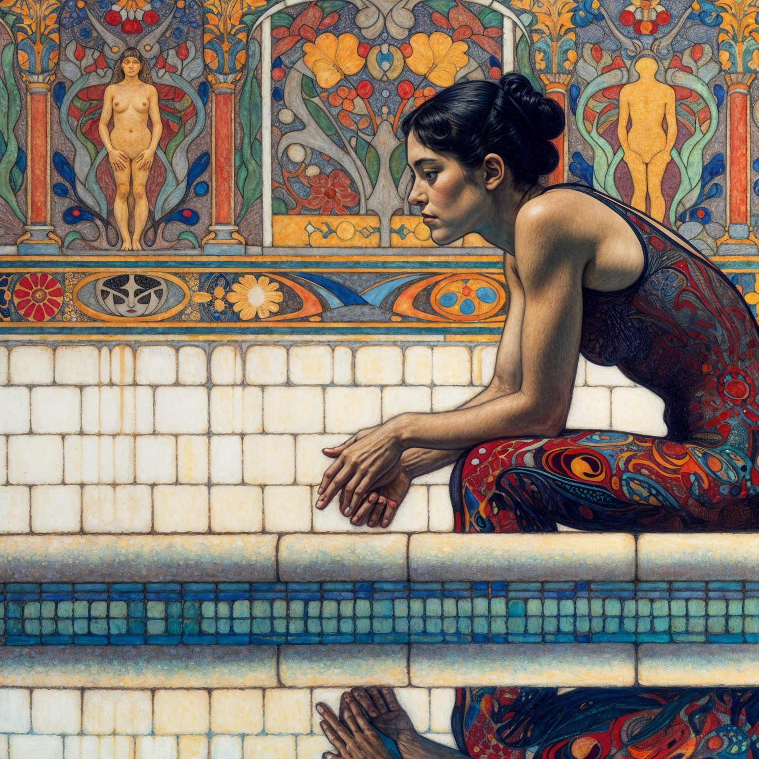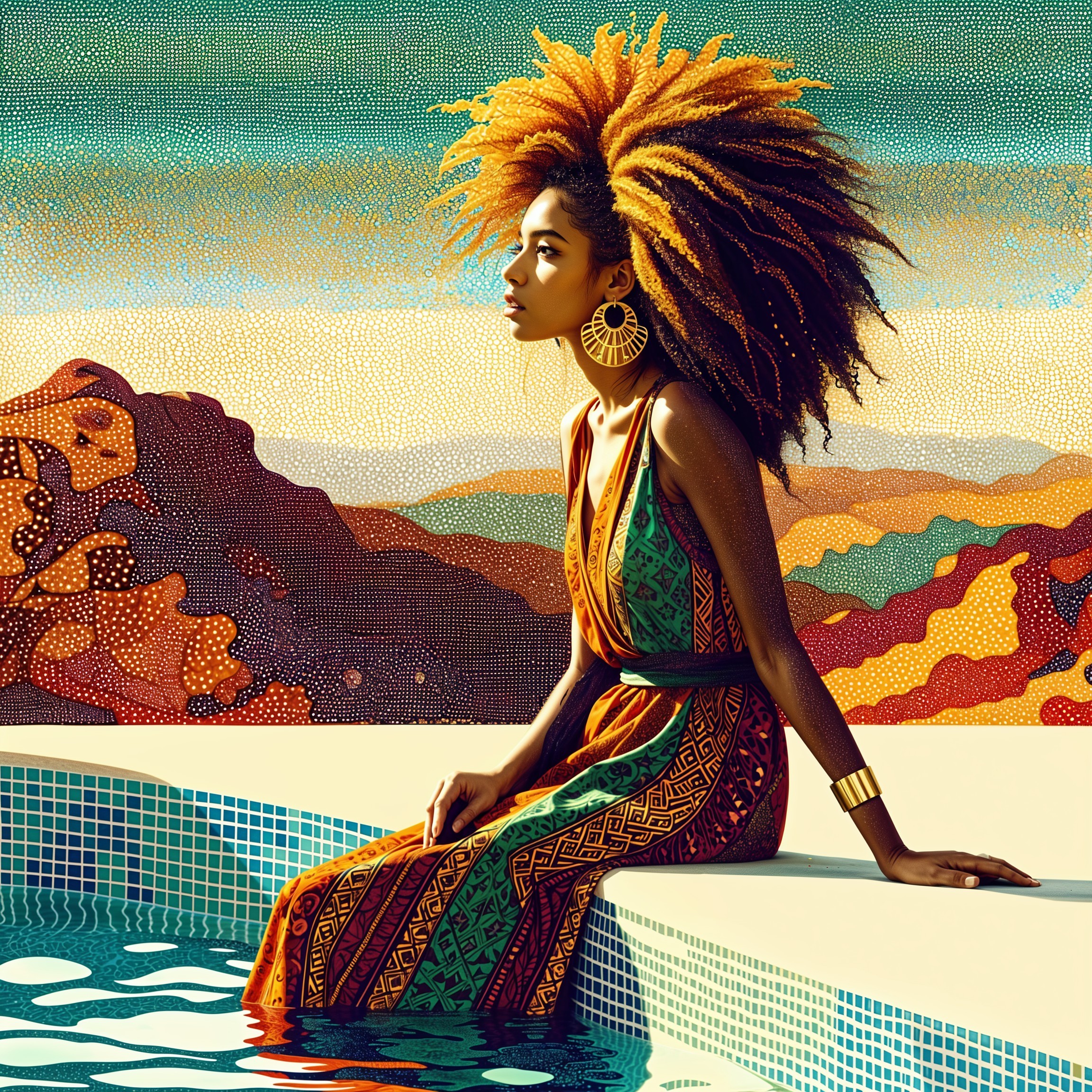 A striking image of a figure lounging by a pool, with intricate, colorful circular patterns in the background. The figure's textured hair and swimsuit echo the vivid designs around her.
