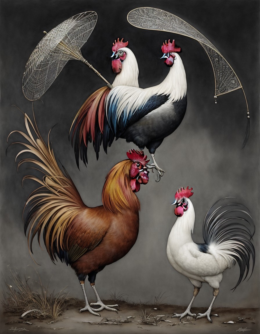 A woman in vintage clothing holds a parasol and a tray of eggs, with two realistic roosters by her side.