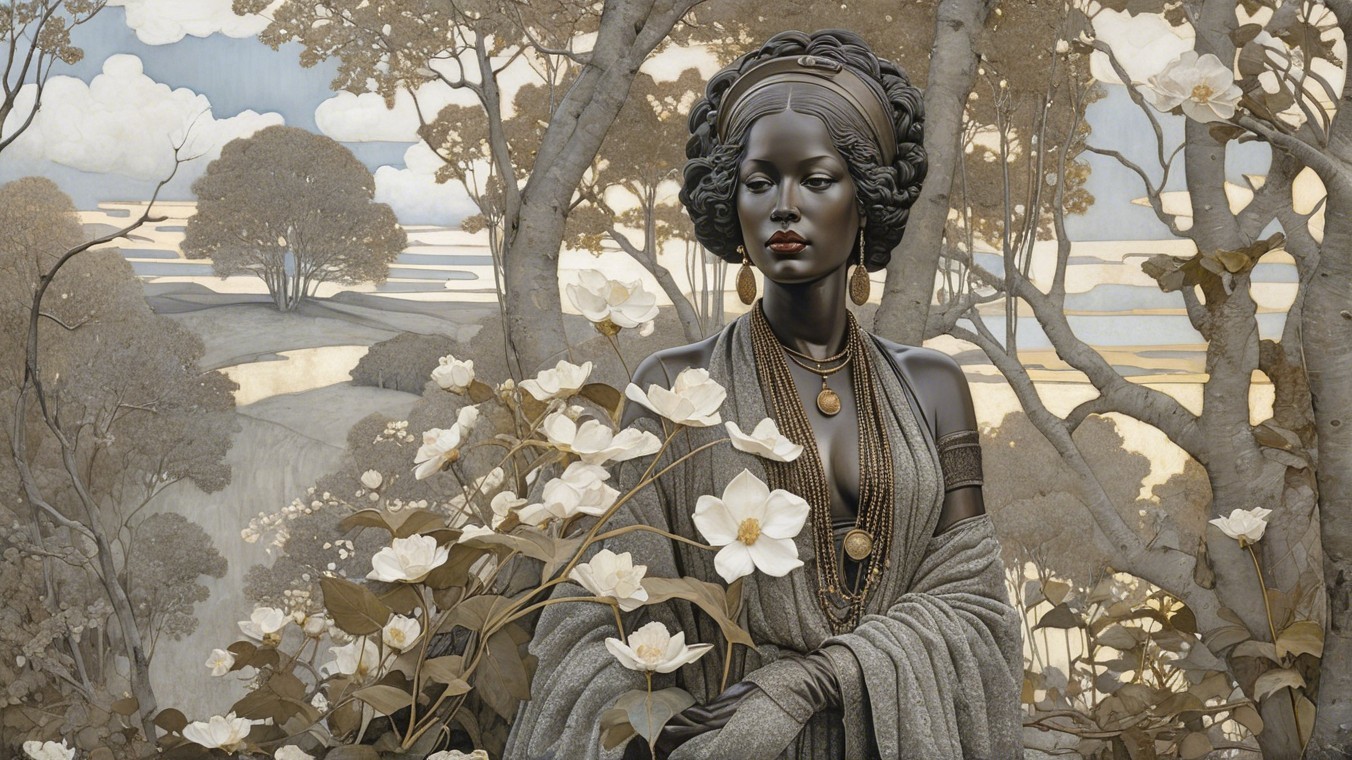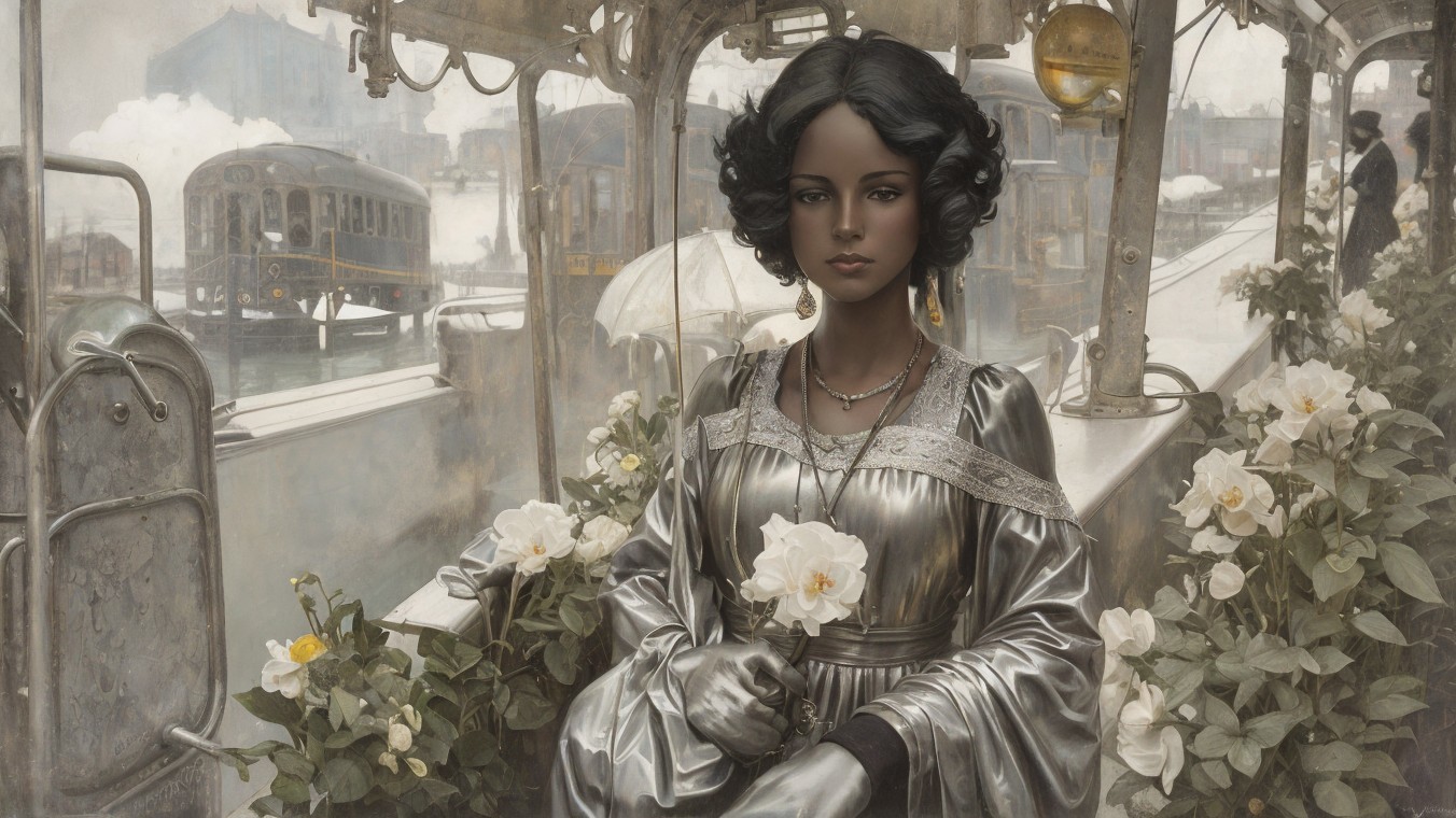 I saw a gal at the vaporetto stop, nostalgia, Mercury Glass patina, moody, somber, desaturated colors. In the style of John Rogers cox . This artwork amalgamates the artistic styles of Michael Parkes, . Art by Andrew Wyeth, Erin Hanson, Klimt, CE brock, H. R. Millar, Dee Nickerson, Arthur Rackham. 3d, extremely detailed, beautiful, watercolor and ink, mixed media, Best quality, Very high definition, super clear resolution, cinematic, intricate, fantastic view beautiful dynamic lighting high definition hdr * Random prompt award winning Max Ernst ultra detailed 4K 3D Texture