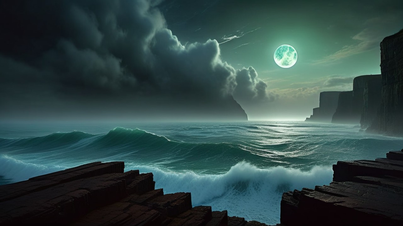 A dramatic seascape with towering cliffs beneath a swirling, luminescent moon. Dark clouds loom overhead as waves crash against the shore, creating a mysterious and powerful atmosphere.