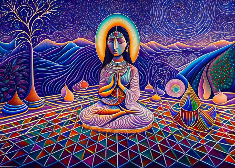 Colorful psychedelic artwork: Woman meditating with intricate patterns and geometric shapes