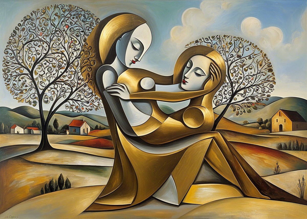 The painting features two abstract figures embracing, surrounded by stylized trees and a serene landscape. The warm earthy tones create a sense of intimacy and connection between them.
