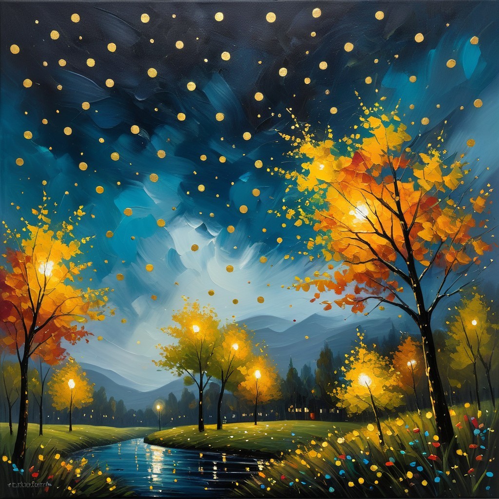 Technique: Oil on canvas, extremely thick application of paint, partly spatula technique. Golden dots and sprinkles have been applied and spattered with a fine brush, moving dynamically across the picture like a flock of birds in the sky.