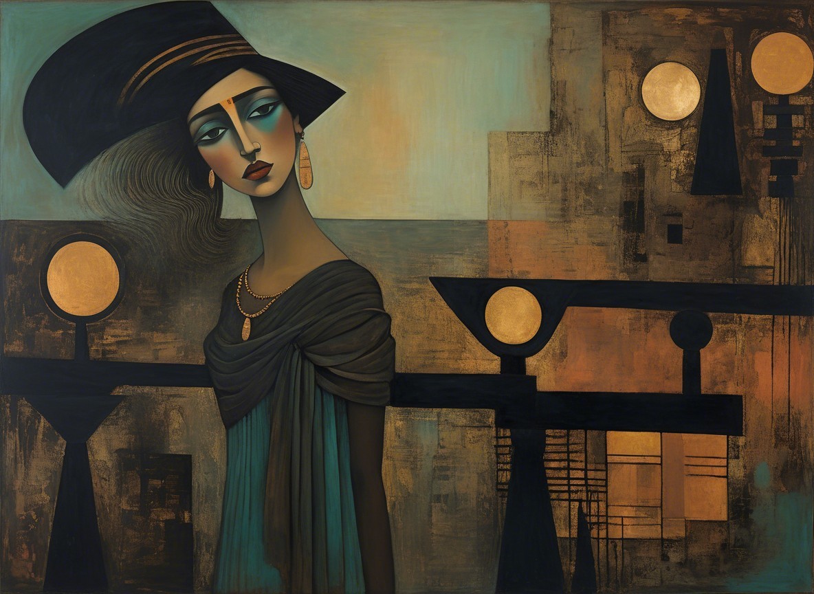 Queen of the Nile. foggy nostalgia, portrait in Burnt umber and soft teal, salmon gold, smoke and mirrors, patina of, battery acid, art brut, moody, somber, desaturated colors, in the style of Paul Klee, Arthur Rackham Dark and moody oil painting of a woman with piercing black eyes, inspired by the works of John Singer Sargent and Edgar Degas, long shot, realistic texture, dramatic lighting, intricate details on clothing and Magical woman fading tones of melancholy and summer nostalgia, soulful portrait, in burnt umber, plutonium, patina of mercury glass, tea stains, art brut, moody, somber, desaturated colors, in the style of Paul Klee, Banksy, Arthur Rackham, based on Prompt by KRW