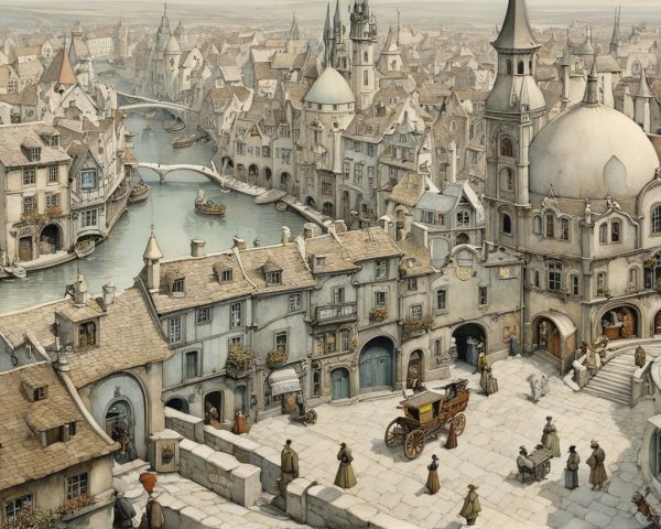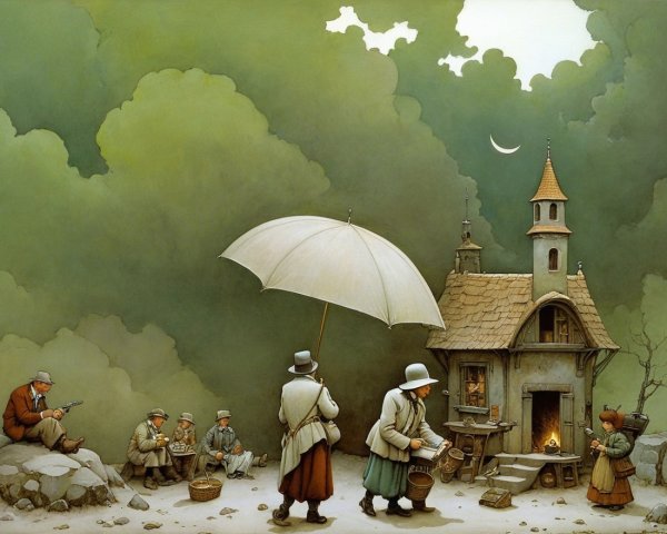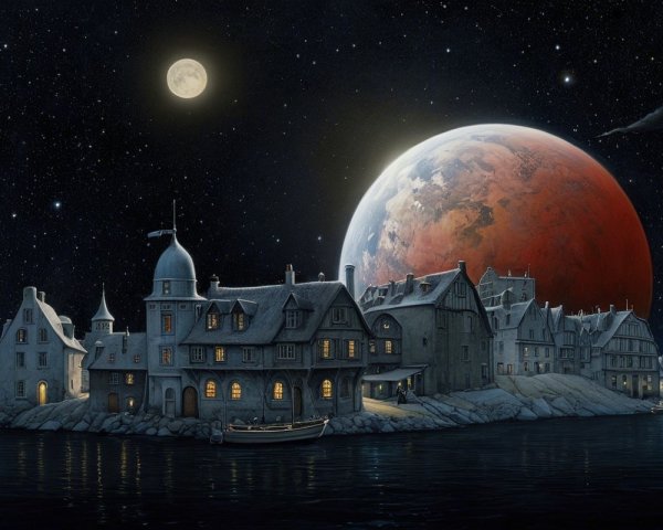 A surreal landscape features a large, stylized face in profile, overlooking an abstract cityscape with geometric buildings and smooth sail-like forms, all depicted in shades of blue and gray.