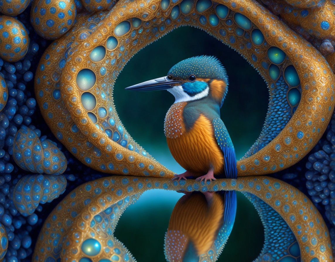 Kingfisher bird perched with reflection, framed by ornate blue and gold patterns
