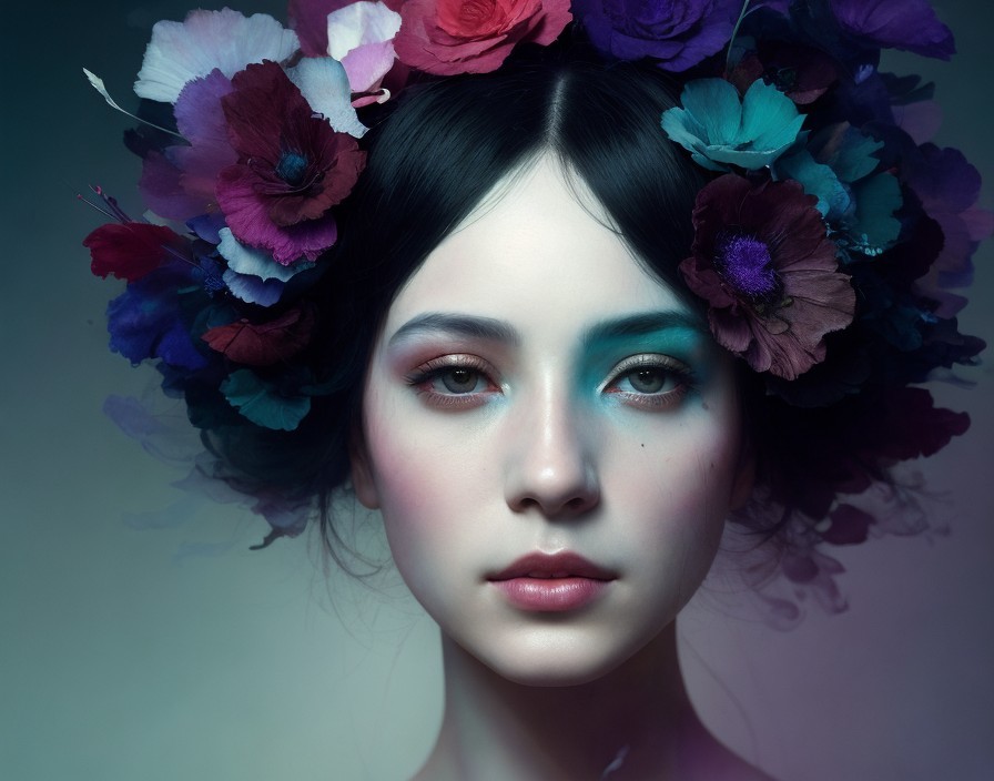 A painting of a woman with a vibrant floral crown and striking blue eyes.