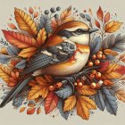 A vibrant bird perches amidst a backdrop of autumn leaves and berries, showcasing rich oranges, yellows, and reds that capture the essence of fall in a beautifully detailed illustration.