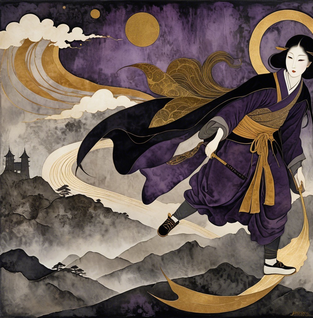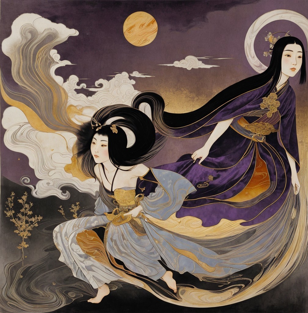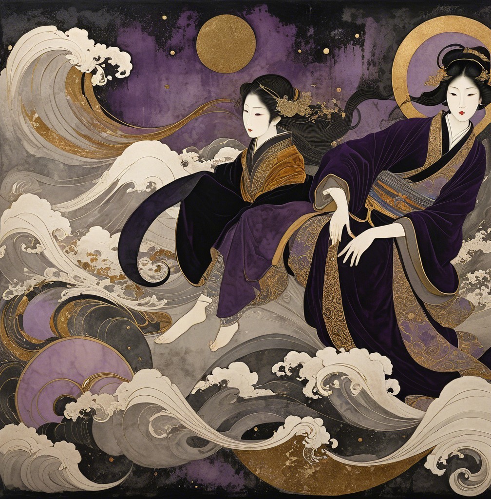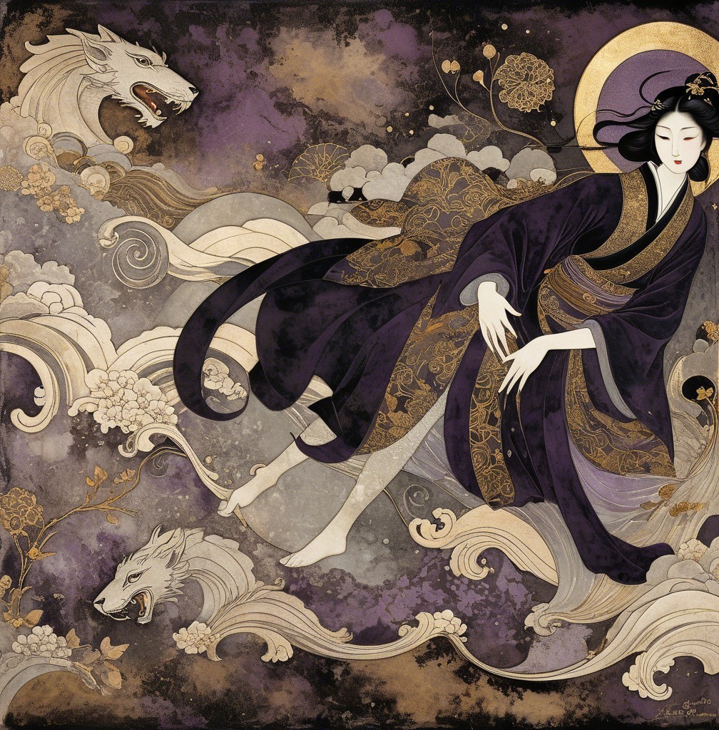 Legend of the Girl and the phantom, Medieval Japanese Artists Sumi-e Style, Velvet blush purple, Shabby, Dull Gold, Amber Gray, marbled. dramatic