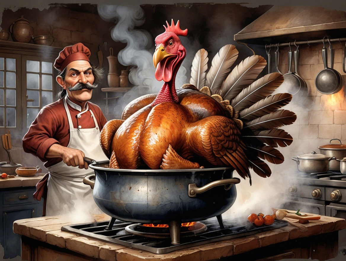 A whimsical kitchen scene features a chef in a white hat and mustache, humorously cooking a giant turkey in a pot, complete with its feathers
