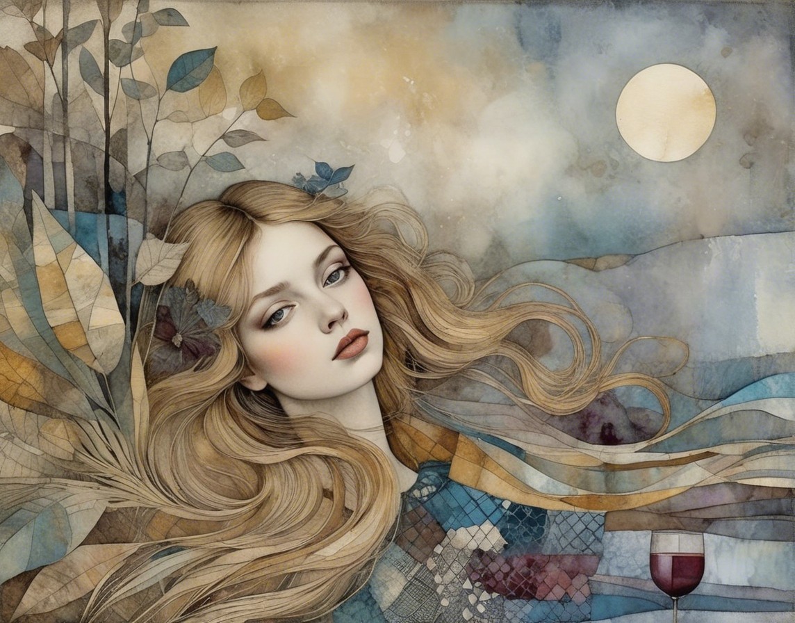 A serene woman with flowing hair gazes softly towards the viewer. The background features abstract geometric patterns and a tranquil sea, with boats sailing under a luminous moon.