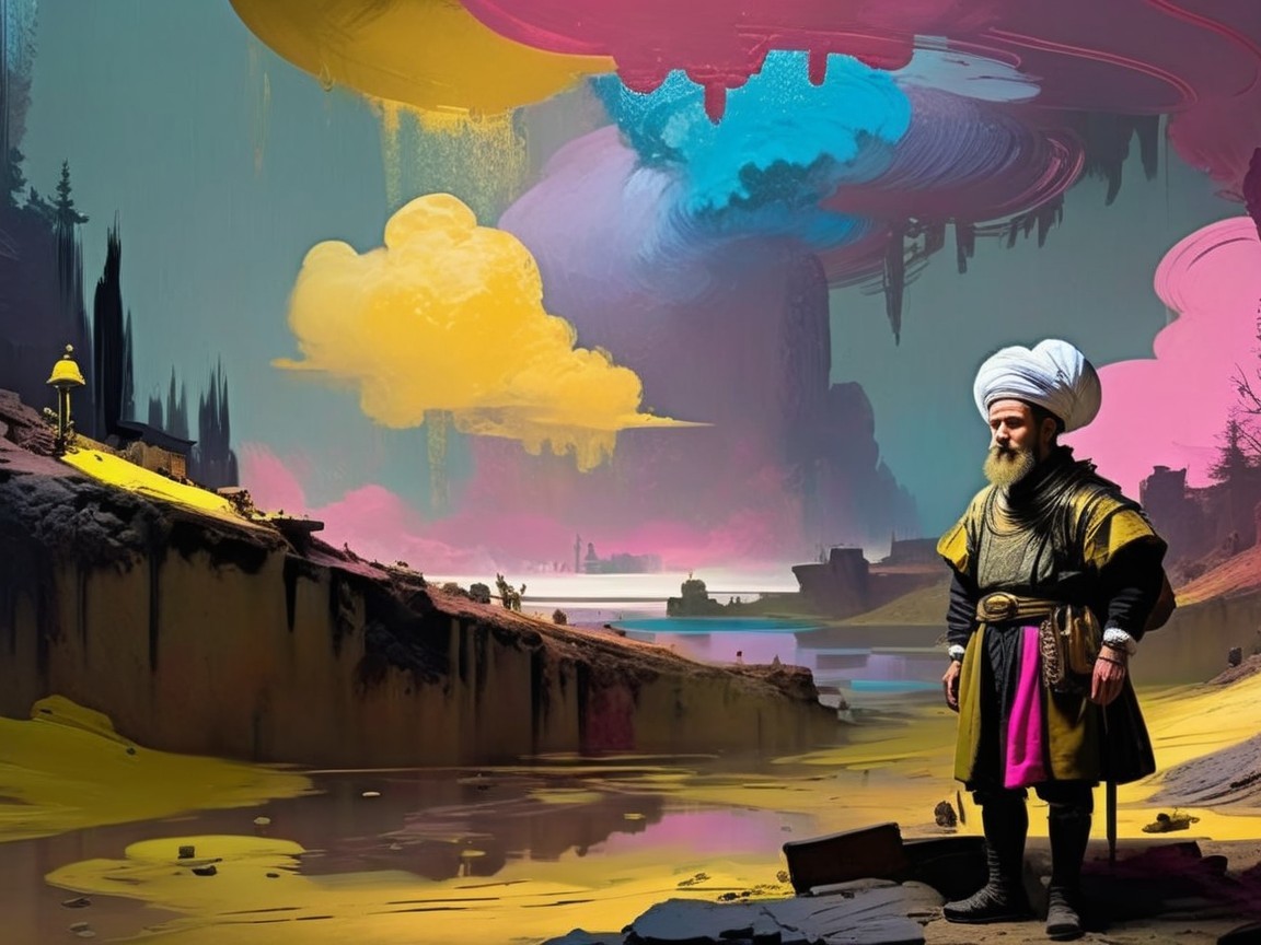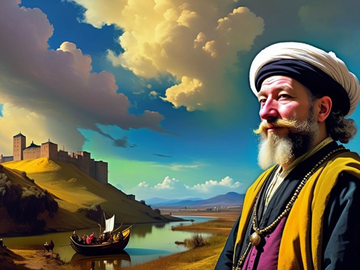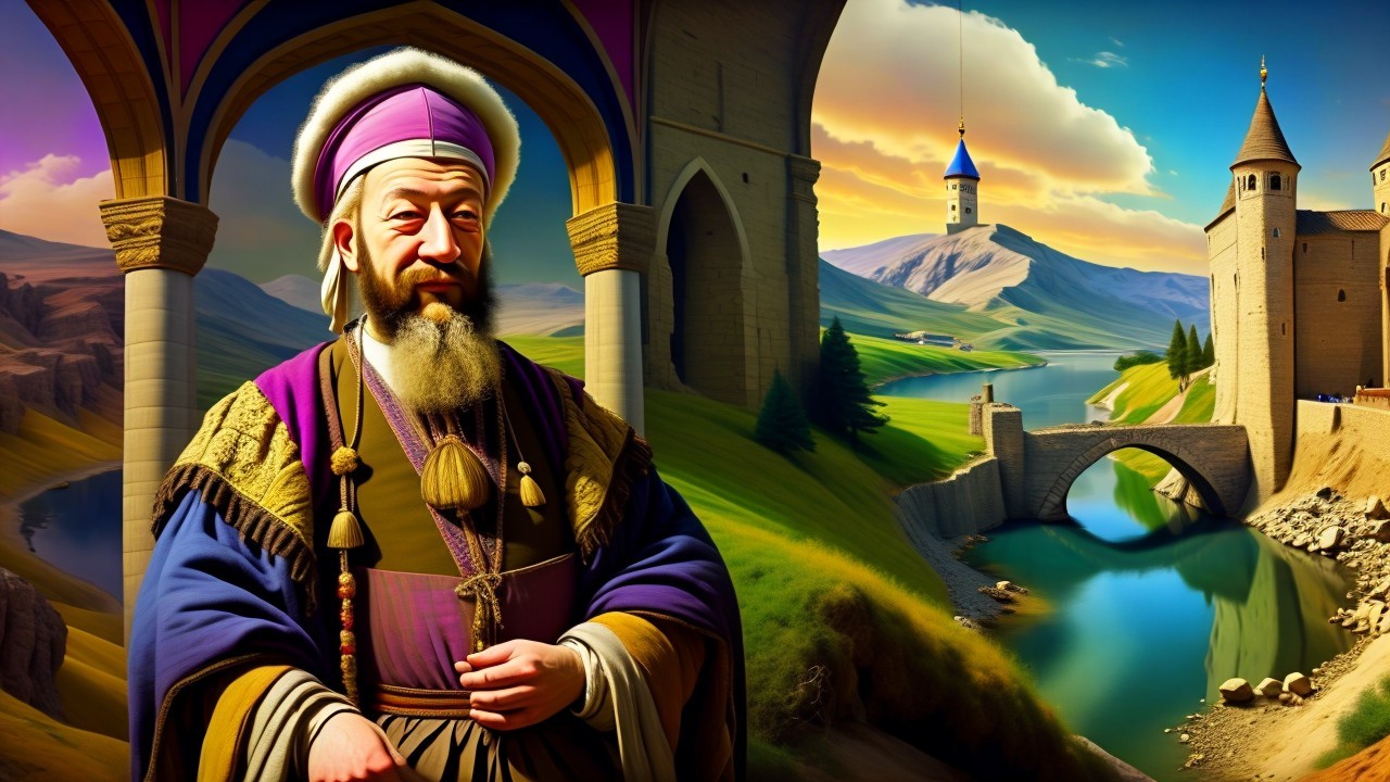 A regal figure stands in a castle archway, wearing a vibrant purple coat and a wide-brimmed hat. In the background, a majestic castle with spires overlooks lush, green hills and a flowing river.