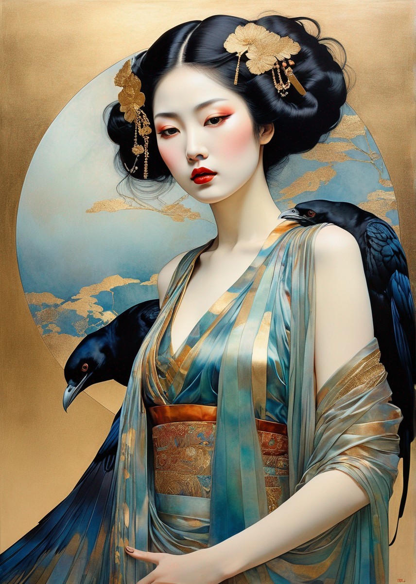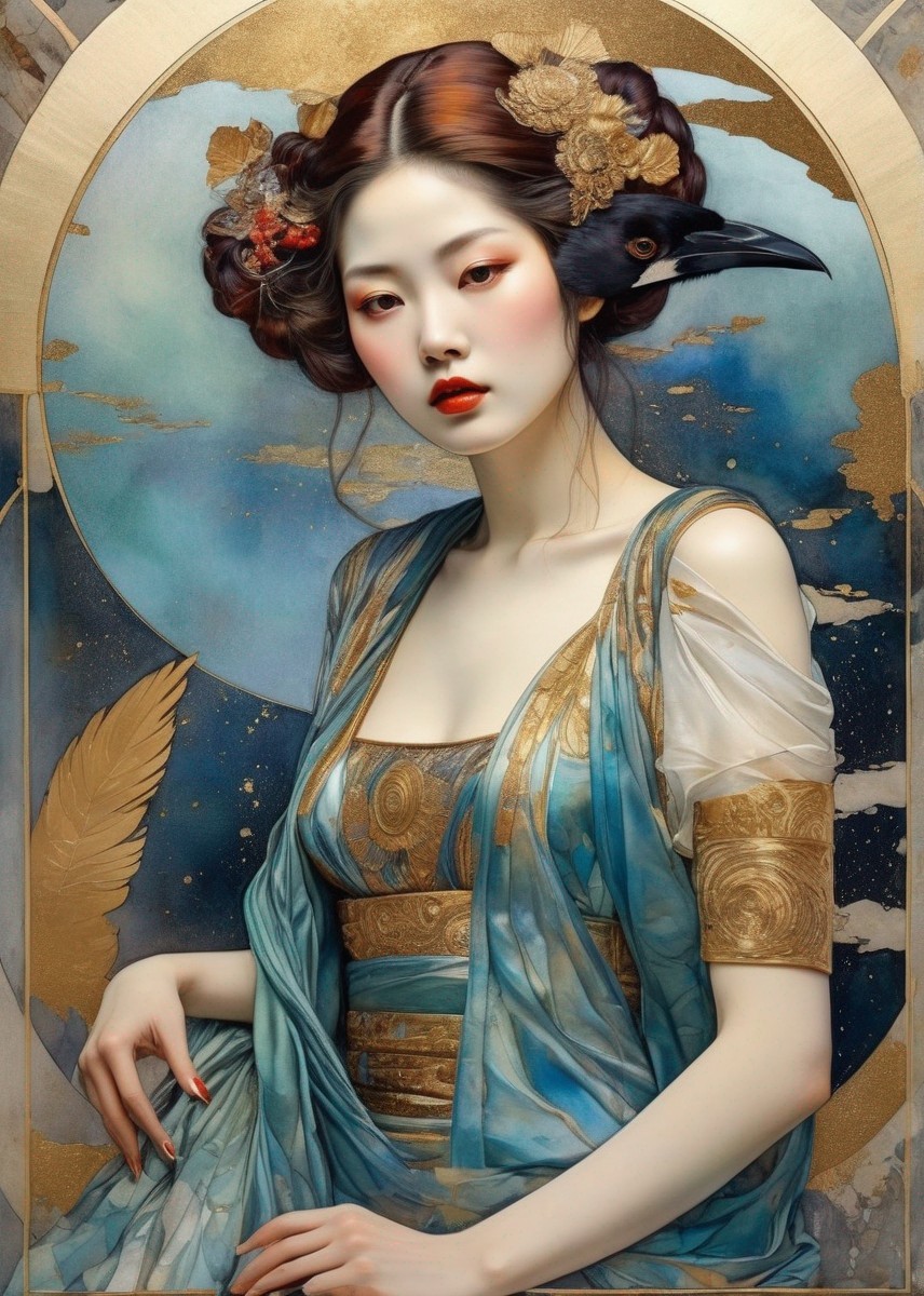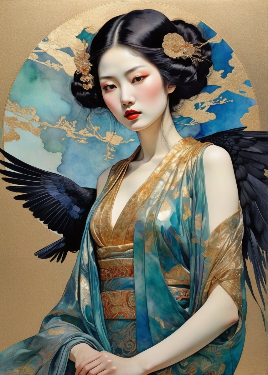 Prompt: "Double exposure,in silk iridescent texture, Klimt paint beautiful Japanese woman, in watercolor and ink imperial colors whit gold foil detail, Raven tormenting her from above, Art Deco by Enki Bilai, Annigoni, Egon Schiele, Milo Manara, Botticelli, Catrin Welz-Stein, Jean Metzinger, Klimt, perfect eyes, perfect handsface, highly detailed, splatter, dynamic pose, dark blue background"