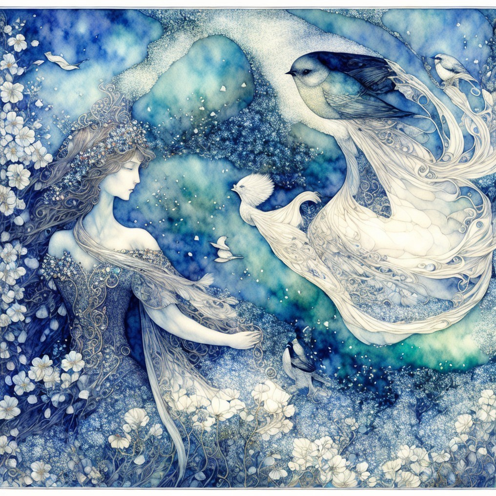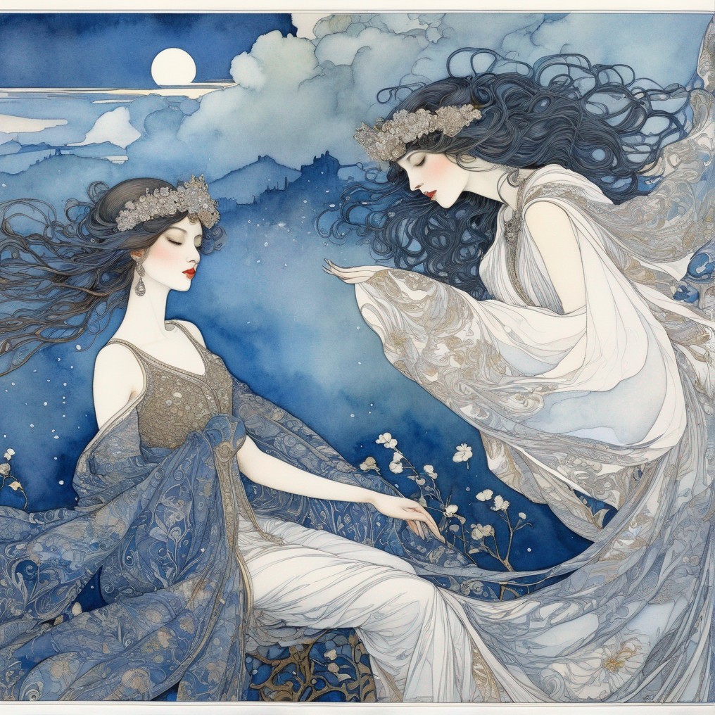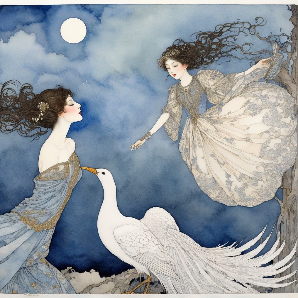 An Art Nouveau-style illustration depicts a woman in flowing attire with a bird on her hand against a moon backdrop.