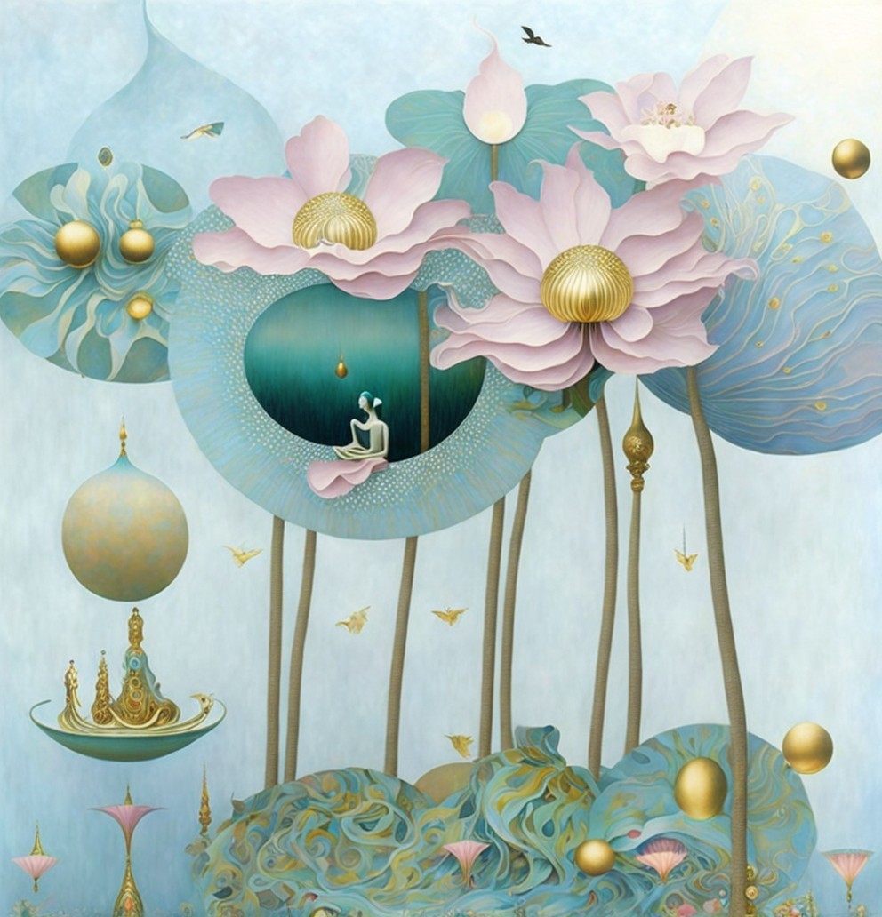 Prompt: Tableau vivant of zen meditations, oil on canvas early 19th century (1900s-1930s) painting inspired by Hieronymus Bosch, Erte, Klimt, Stanislav Senchuk, Arturo Elena, Dalí, Toulouse-lautrec, mucha, Ernst. , illogical pairings, surreal-art nouveau blend and fusion of styles, celestial elongated female subjects with organic shapes and exaggerated proportions, wearing flowing dresses or robes, soft pastel jewel tones (rose, sage, lilac, aqua, seafoam, , golden luster, pink and sea foam undertones, luminous opalescent skin, floating gilded dharma wheels, prayer beads, om and chakra symbols in delicate gold filigree, butterflies, mythical tiny spirit animals, dreamlike lighting, magical and peaceful, lush garden of paradise. subtle ivory pearl-escent undertone in all hues, painterly effect with visible brush strokes.