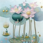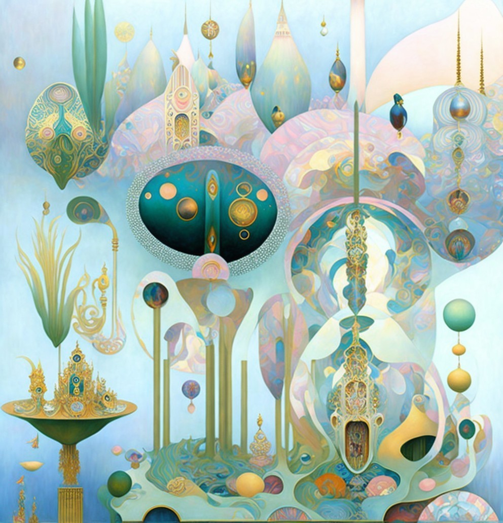This ethereal artwork features graceful figures amidst swirling pastel shapes and intricate patterns. Dreamlike elements blend harmoniously, creating a serene and fantastical landscape.