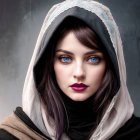 The image features a young woman with long, wavy hair, adorned with a white hood and elegant earrings. She gazes softly, wearing a black outfit with intricate golden detailing against a classic background.