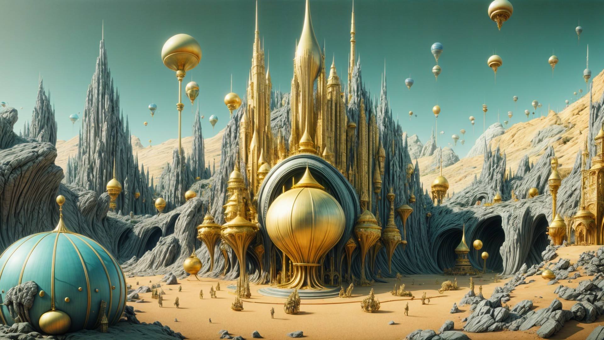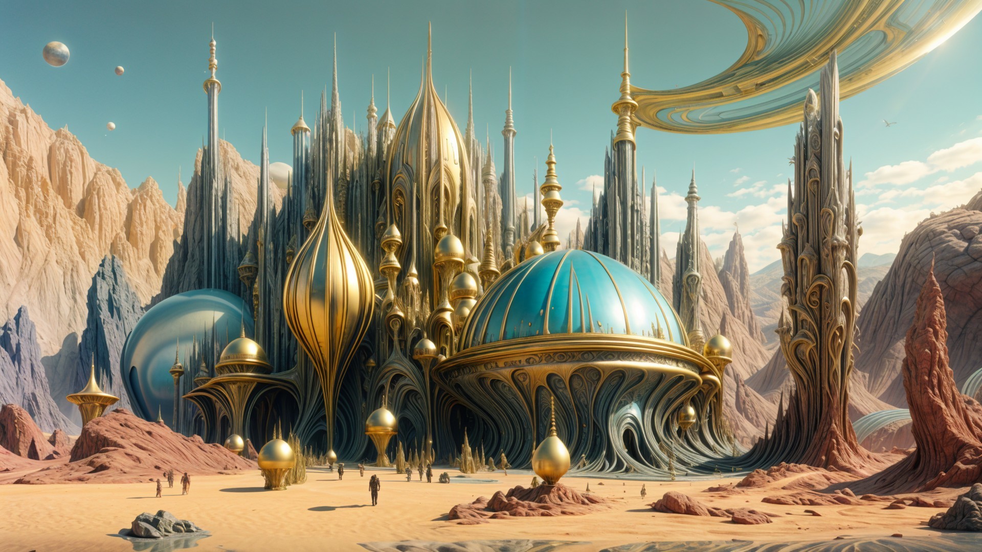 A surreal landscape features towering, fluid structures resembling golden rock formations. In the distance, majestic mountains and floating celestial bodies create a striking, otherworldly scene.