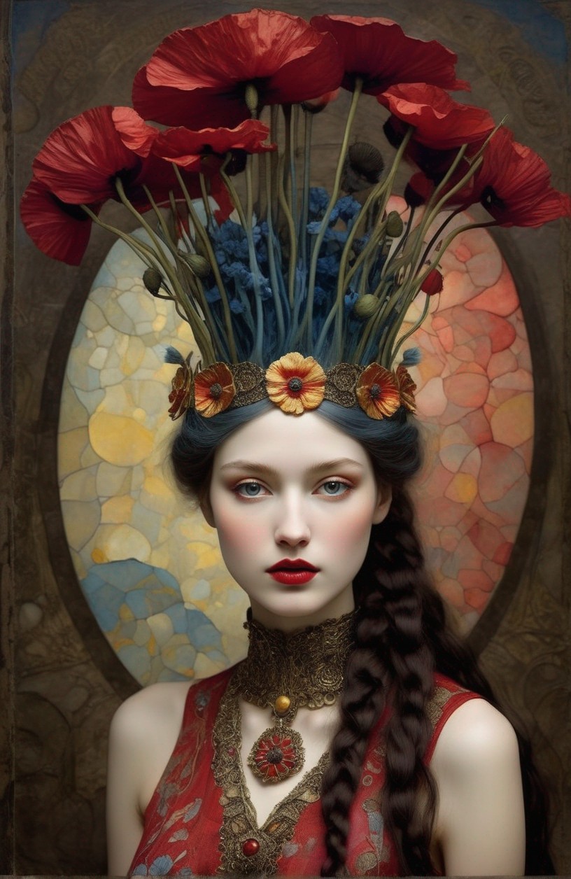 + Prompt:Single image. Art nouveau. The quantum nature of things. A nymph of flowers. Poppies. colors: crimson, grey-blue, pale lemon yellow, greenish gold, metallic bronze.