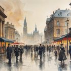 A bustling street scene in a vintage city, with people in period attire walking on a wet pavement reflecting buildings and a clock tower. Warm hues illuminate the cloudy sky at dusk.