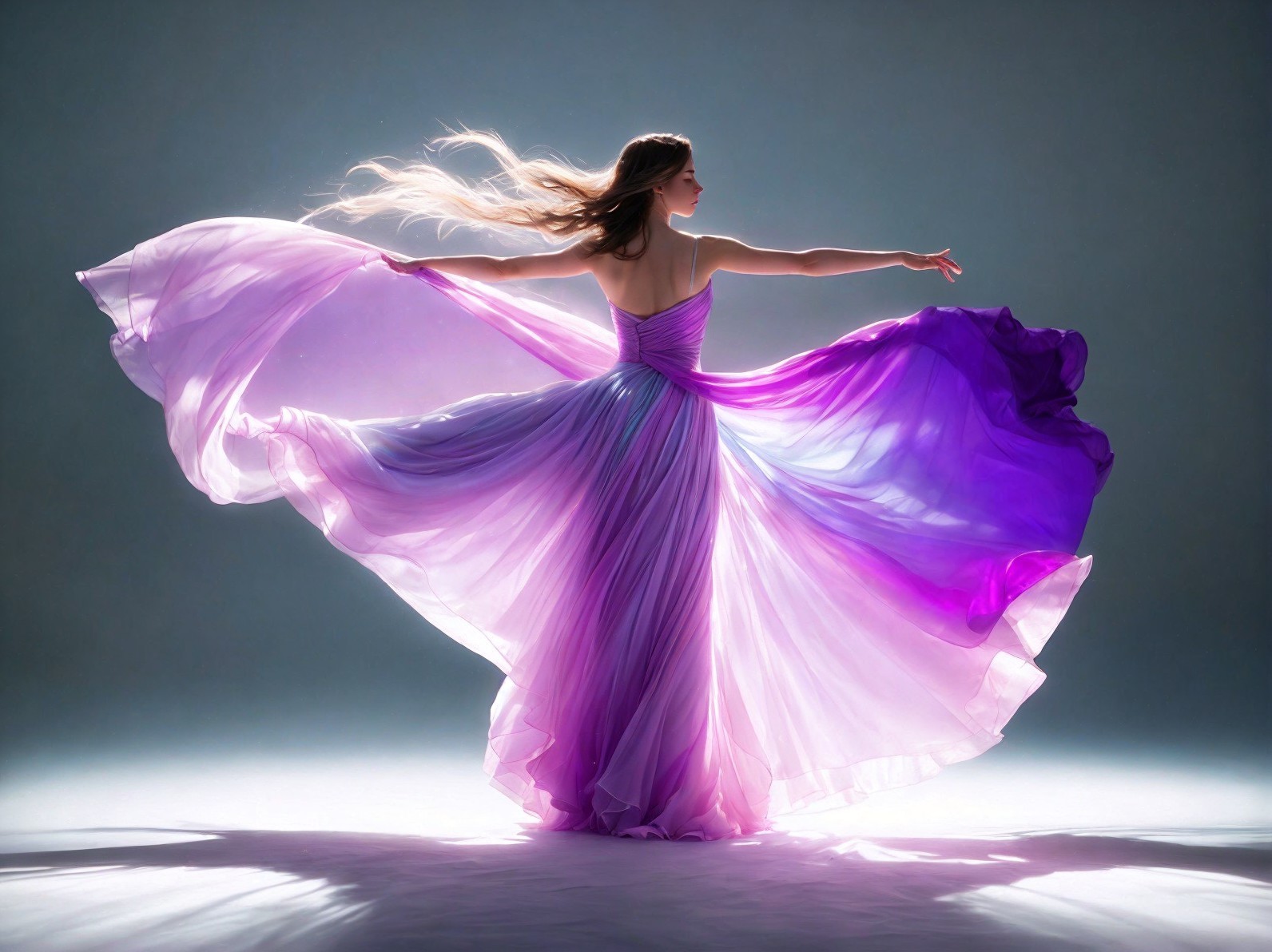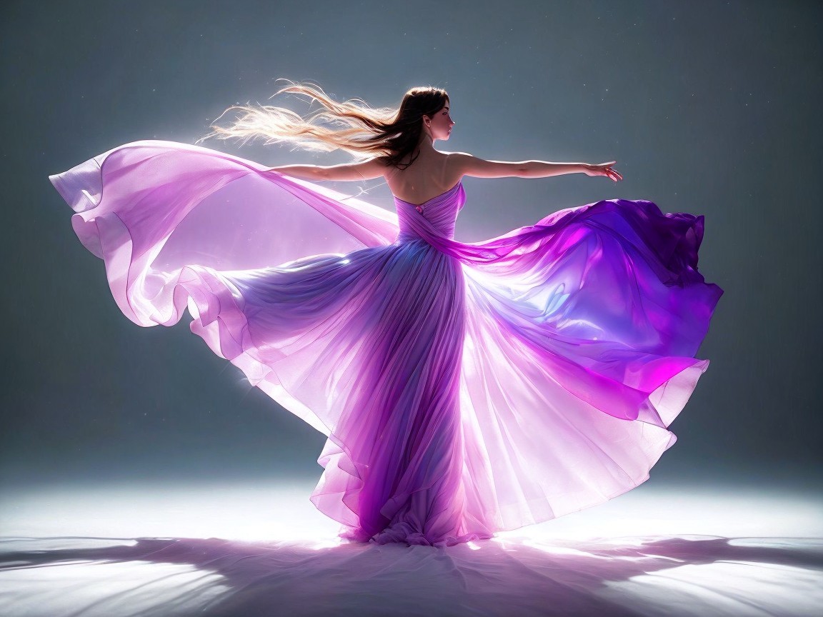 (Try from Наталья) - A woman in a flowing purple dress twirls gracefully, her hair dancing with the movement. The soft, glowing background enhances the ethereal quality of the moment.