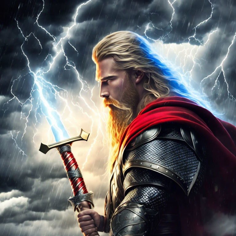 Illustrated warrior with hammer under stormy sky in armor and red cape
