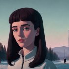 A serene winter scene depicts a young woman in a light blue coat, standing in the foreground with long dark hair. Snow-covered mountains and skiers populate the background under a pastel sky.