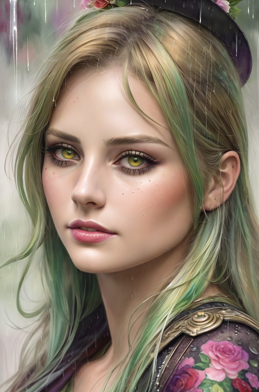 TInts of Barbara canepa and Overton Loyd, Watercolor and ink portraiture, beautiful female enchantress in rain, greenish chaotic background, edwardian, detailed cheeks, realistic nose, wavery ink, gouache paint, grunge, High coloring, detailed close-up portrait, stylized face , watery alcoholic painture and ink, Delicate, Dainty, Petite, Slender, Rosy-cheeked, Bright-eyed, Smiling, bioluminescent eyes, Soft hair, flares and splashes, soft edges, back-lit, triadic color scheme black beige red, style of wet on wet painting, hues, gothical, instaport style 1.6, 3d lighting effects, fauvism 1.7, chiaroscuro lighting, ambient occlusion 1.5, shadow mapping 1.3, intricate stylized hairstyle, brightness 1.7, coherent, hues, eerie, occult, retropunk, creamy, plasticity 1.6, sweaty, tribal, occult, Anglocore 1.9, auracore, high coloring 1.9, mosscore 1.7, cottagegore 1.9, retrofuturistic details of ornate, maximalism, radiance, raytraced shadows 1.8 brightness 1.4, silver particles, dreamy glow, tints of abstract art nouveau illustration, Kinky Pop Surrealism, 3d effects 1.8, shadow mapping 1.3, dynamic lighting 1.7, ambient occlusion 1.5, anisotropic filtering 1.9, raytraced shadows, ethereal, otherworldly, abstract style 1.7, hues, grain, blurry aura, fantasy movie still, synthetic essence, tints of 1970s advertising art ,vector 9:5, daguerreotype photography on old paper,cinewash, brightness 1.4,subsurface scattering 1.7