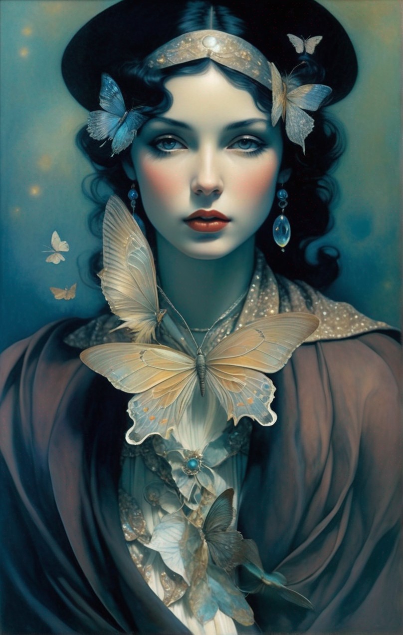 A portrait of a woman with a serene expression, two hummingbirds, starry background, and celestial vibes.