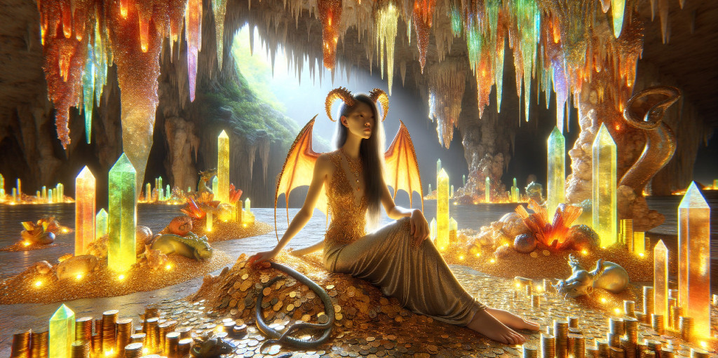 Prompt: "Photo-realistic, Background scene of Cavern full of gold coins and miscellaneous treasures with light reflecting everywhere, multicoloured crystalline stalactites, natural bright sunlight reflecting off all surfaces, Alluring captivating Japanese Dragonoid/Human Hybrid Woman Monster obsessing over her wealth, interwoven with dragonic appendages, woman hybrid's appearance aged in 20s, wearing revealing loose gown that is hanging of every curve of her body, cleavage, Dragon Horns, Dragon Wings, Claws, slender, hourglass body, wide hips, ultra realistically detailed body and face, ultra-sharp focus, intricate, bright warm sunshine, 64K Resolution, HDR."