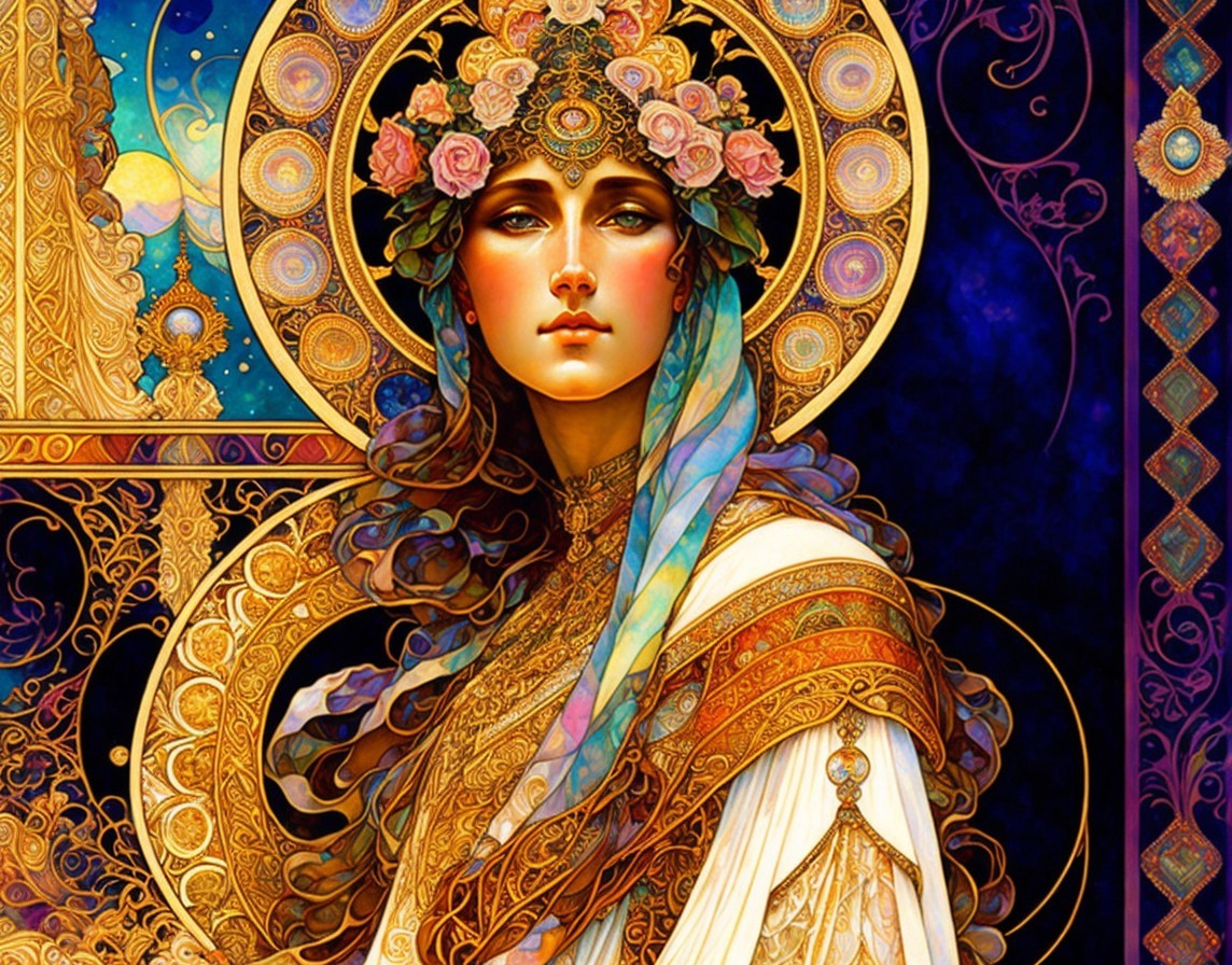 An art nouveau style illustration of a woman with intricate golden headpiece, surrounded by ornate decorative elements and vibrant colors.