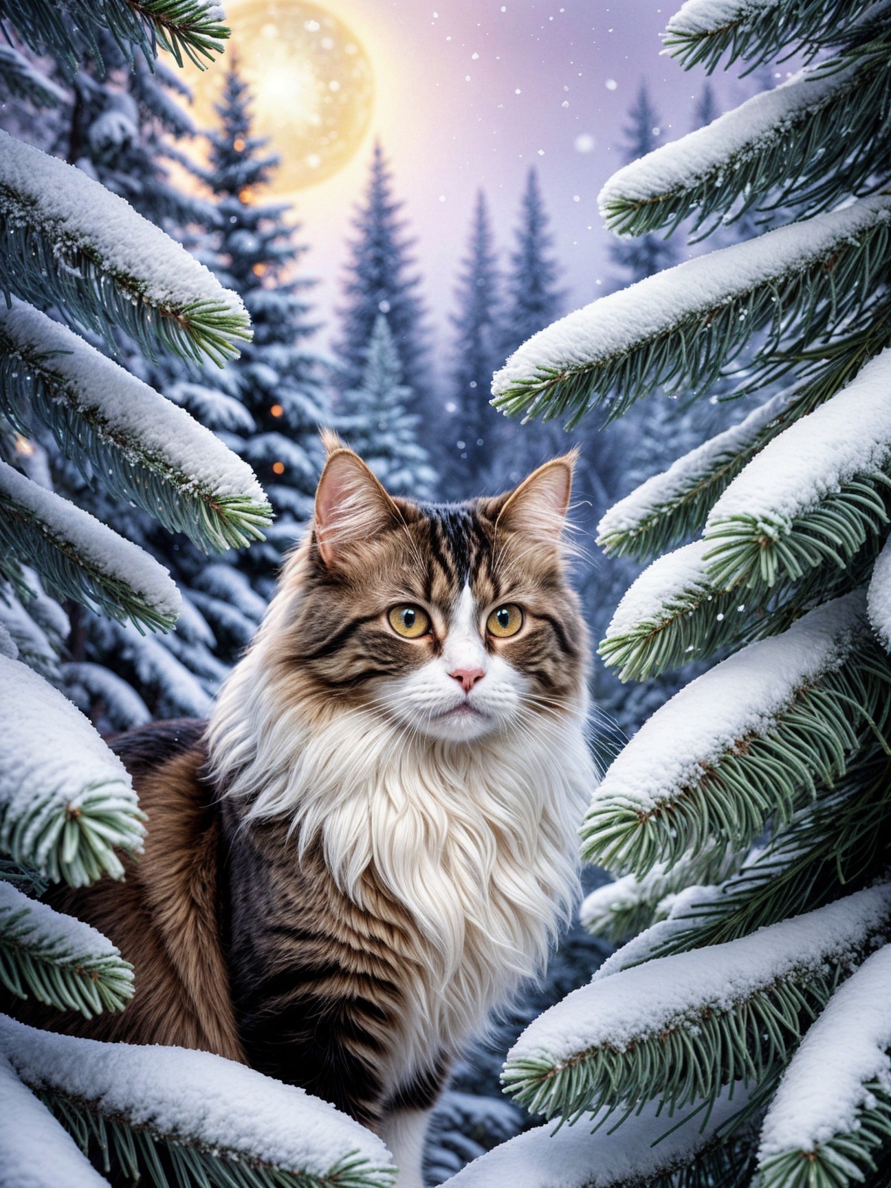 A majestic cat with a fluffy coat sits among snow-dusted pine trees, its striking green eyes gazing thoughtfully towards the viewer, while softly falling snowflakes create a serene winter scene.