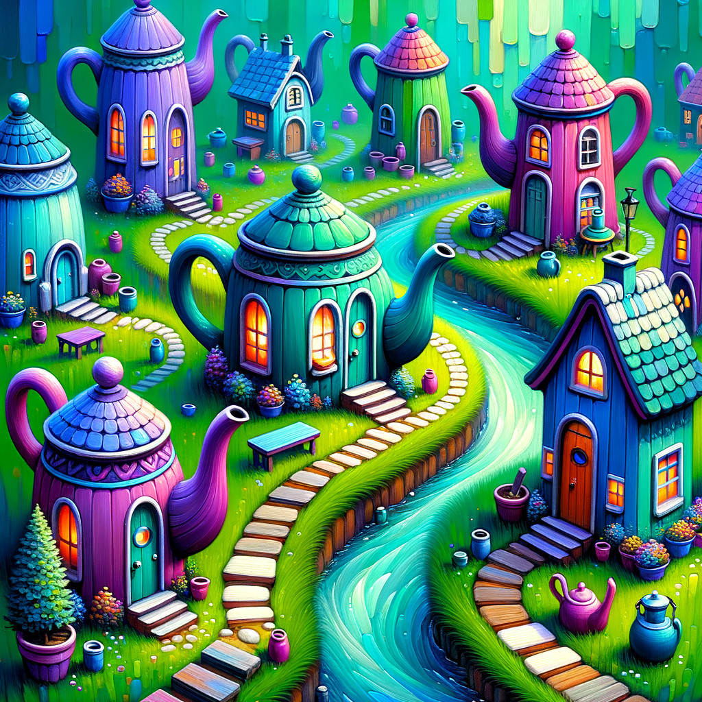 A whimsical illustration of a vibrant village where houses look like colorful teapots, with winding paths and a small blue river. Inspired by a cute clipart image I saw on Shutterstock.