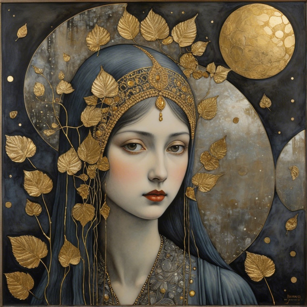 A captivating portrait of a woman adorned with intricate gold jewelry and a jeweled headpiece, surrounded by golden leaves and a bird, set against a dark, textured background with a glowing moon.