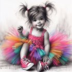 A cute child with big blue eyes and a playful expression wears a colorful, shiny outfit with vibrant pink wings. She relaxes in shallow water, surrounded by cheerful orange balls.