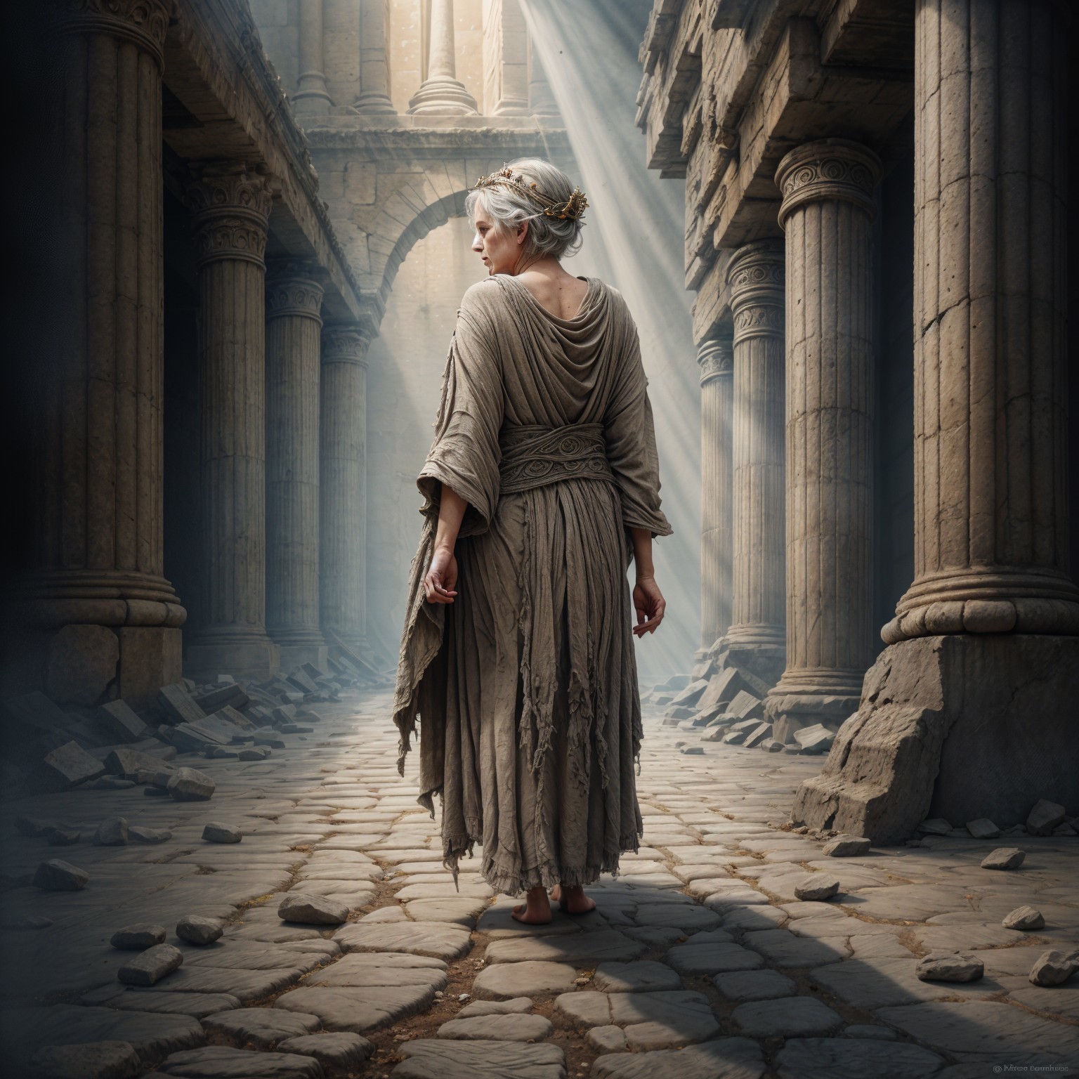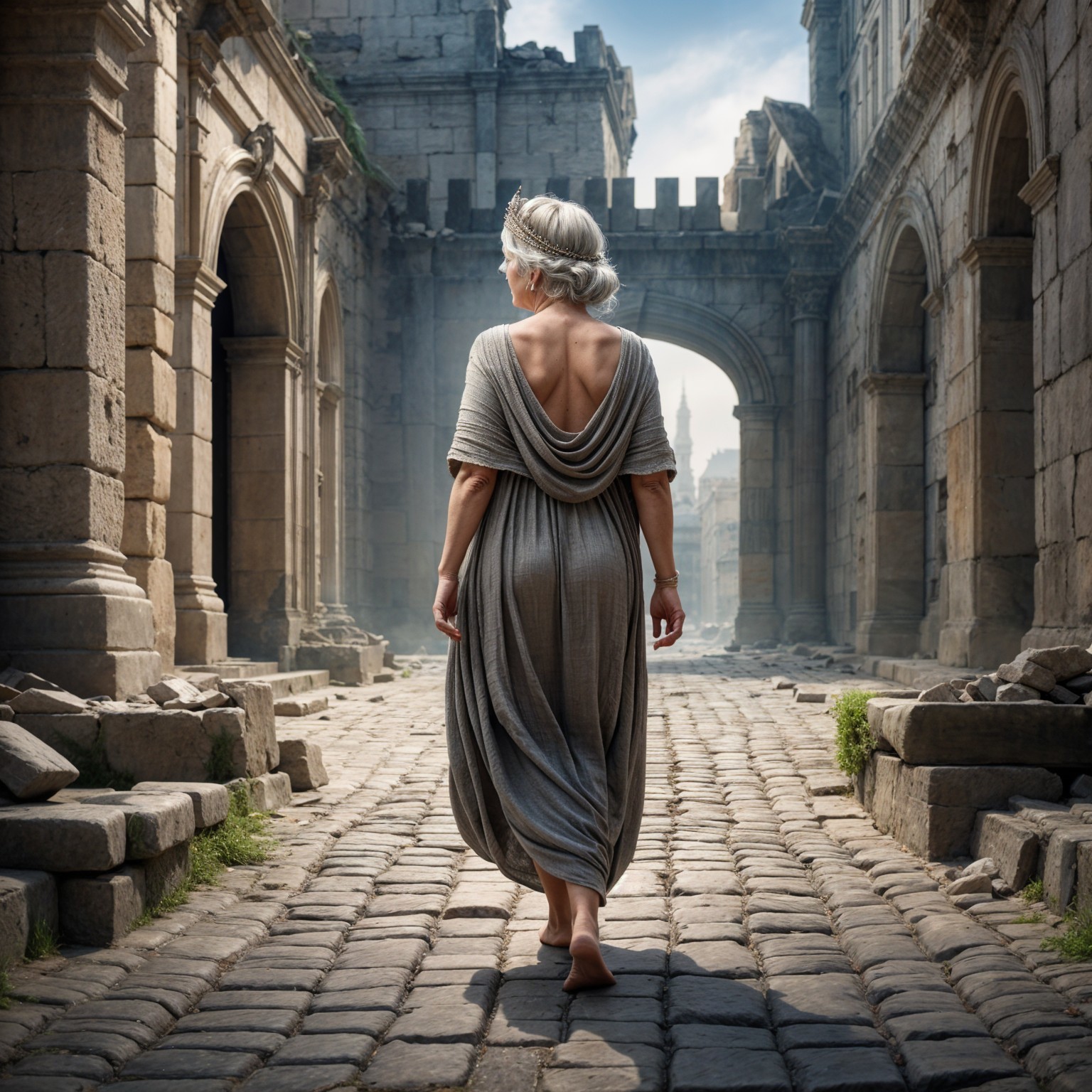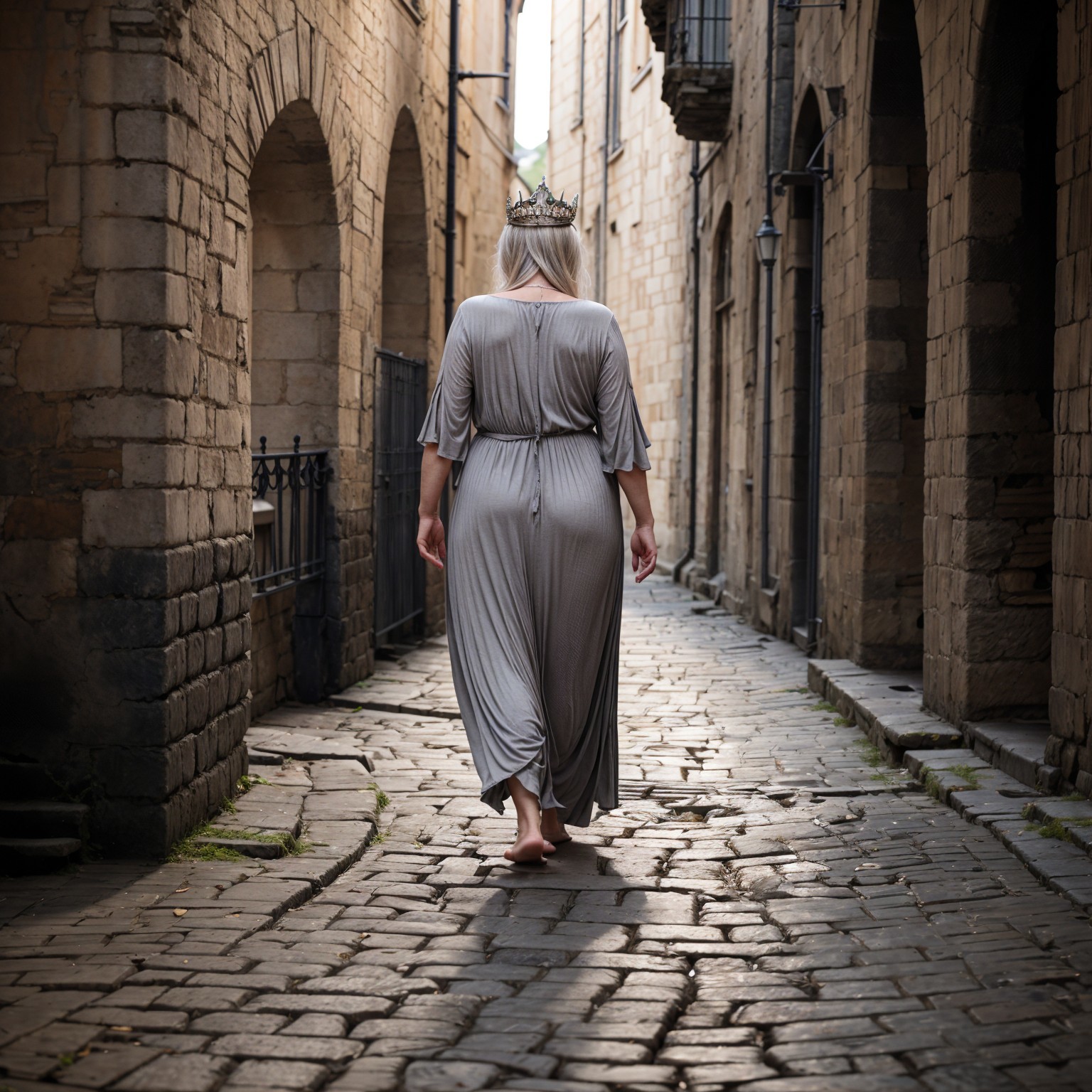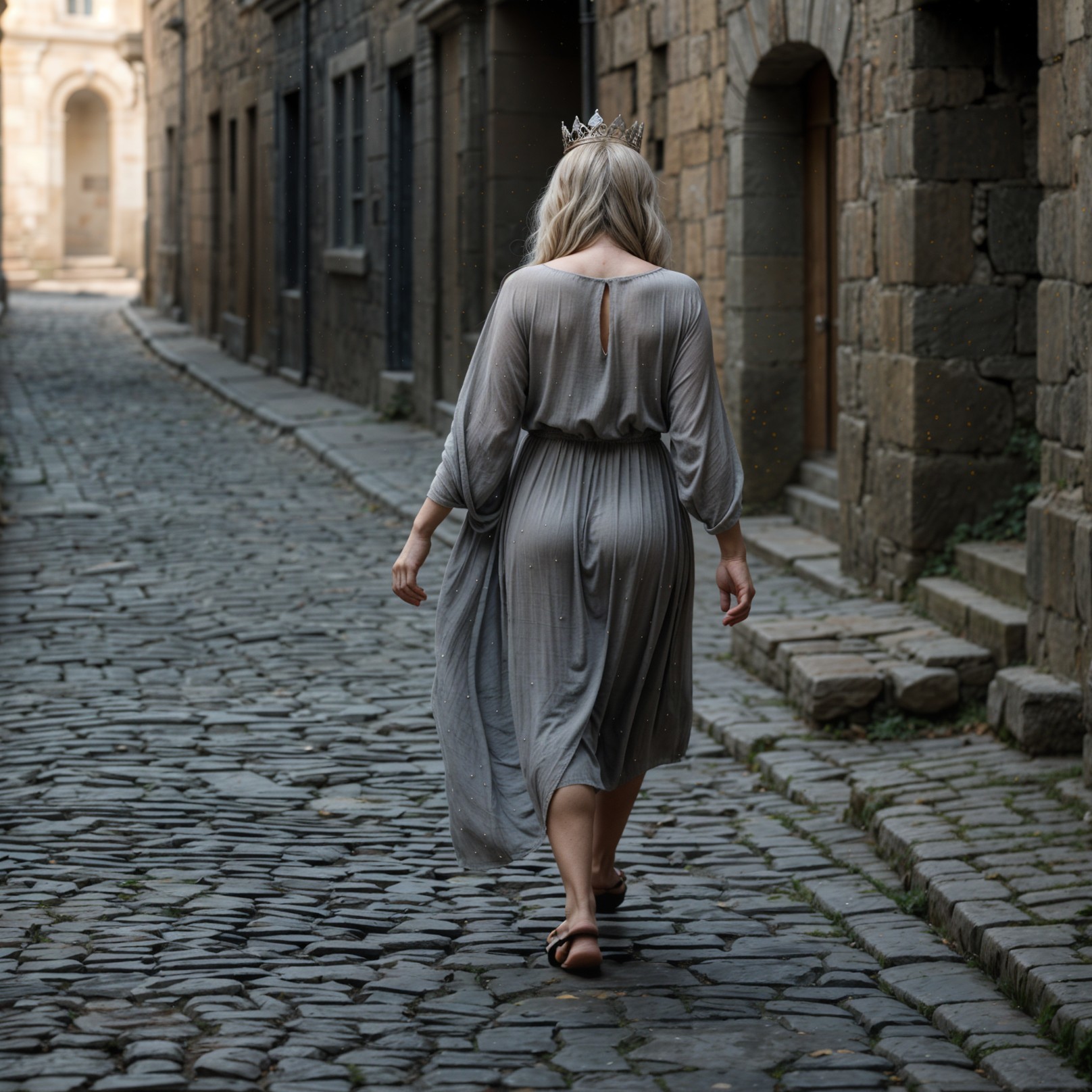 A woman in a flowing gray dress walks barefoot down a cobblestone alley, her back facing the camera. She's wearing a delicate crown, surrounded by historic stone buildings.