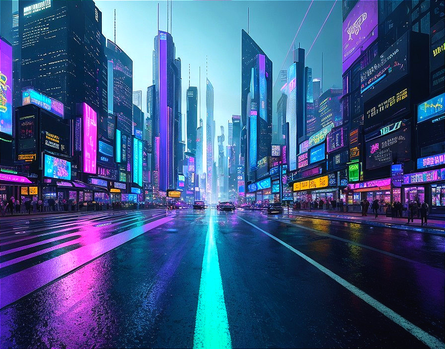 Prompt: Vibrant cityscape at night, futuristic skyscrapers, neon lights, bustling streets, flying cars, holographic billboards, reflections on wet pavement, diverse crowd, advanced technology, cyberpunk aesthetic, digital art, high resolution, detailed textures, vibrant color palette with blues, purples, and neon hues, dynamic lighting contrasts, inspired by Syd Mead and Simon Stålenhag, ArtStation.