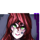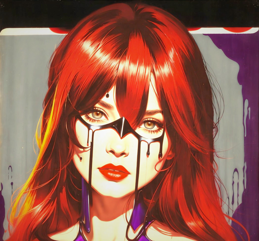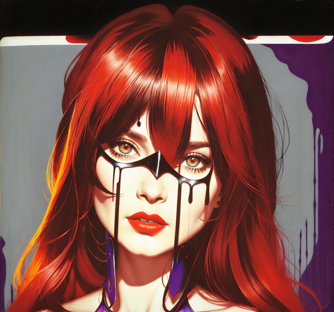 A striking illustration of a woman with vibrant red hair and expressive green eyes. She wears a unique mask, with dripping patterns, and has a dramatic, emotional presence.