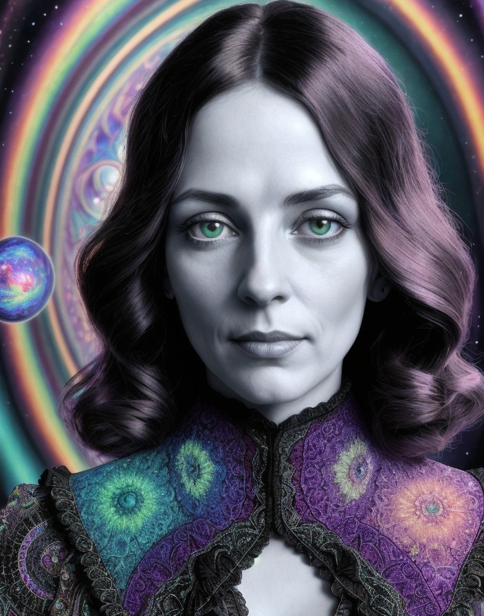 A woman in a ruffled dress stands amidst a fantastical landscape of swirling clouds, ornate towers, and colorful foliage, all beneath a dramatic sky.