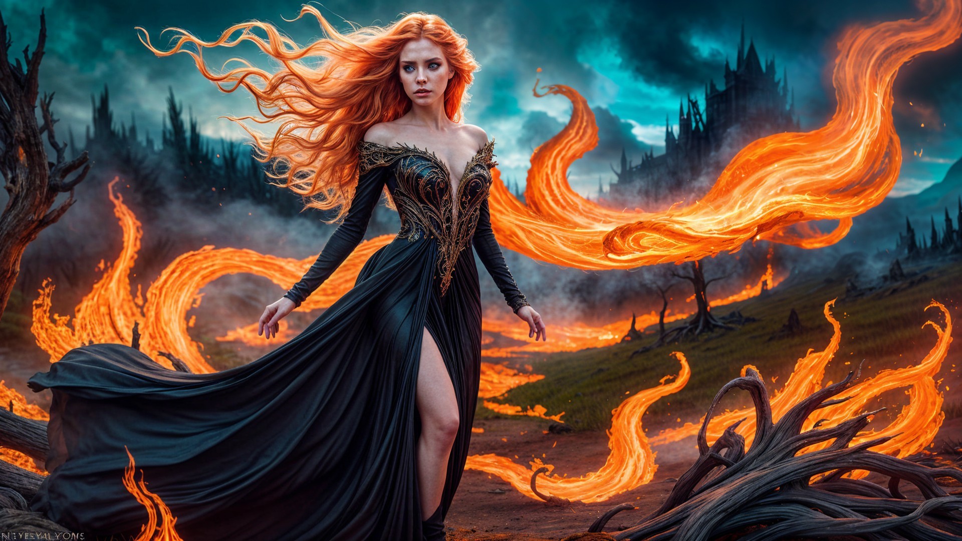 A breathtaking surreal dark fantasy scene featuring an ethereal fire goddess standing amidst a burning, enchanted landscape. Her flowing golden hair extends like flames, merging with the fire around her. Her piercing, glowing green eyes radiate supernatural power, and intricate mystical tattoos shimmer on her skin. She wears a regal, intricate black gown that seamlessly blends into the fiery ground, trailing like molten lava.