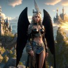 A striking character with long, flowing white hair and large black wings stands confidently on a rocky outcrop. She wears a sleek black armor set, with a mystical castle backdrop and dramatic clouds.
