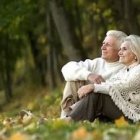 A joyful elderly couple sits together on fallen leaves in a park, surrounded by colorful autumn trees. They share a warm smile, exuding love and happiness in a serene setting.