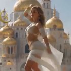 A dancer in a shimmering outfit gracefully poses against a backdrop of majestic domes, embodying elegance and movement in a sunlit setting, with flowing fabrics accentuating her movements.