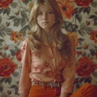 A young girl with long, wavy blonde hair sits on a patterned sofa. She wears an orange floral blouse, embodying a vintage 70s aesthetic, against a backdrop of retro wallpaper.