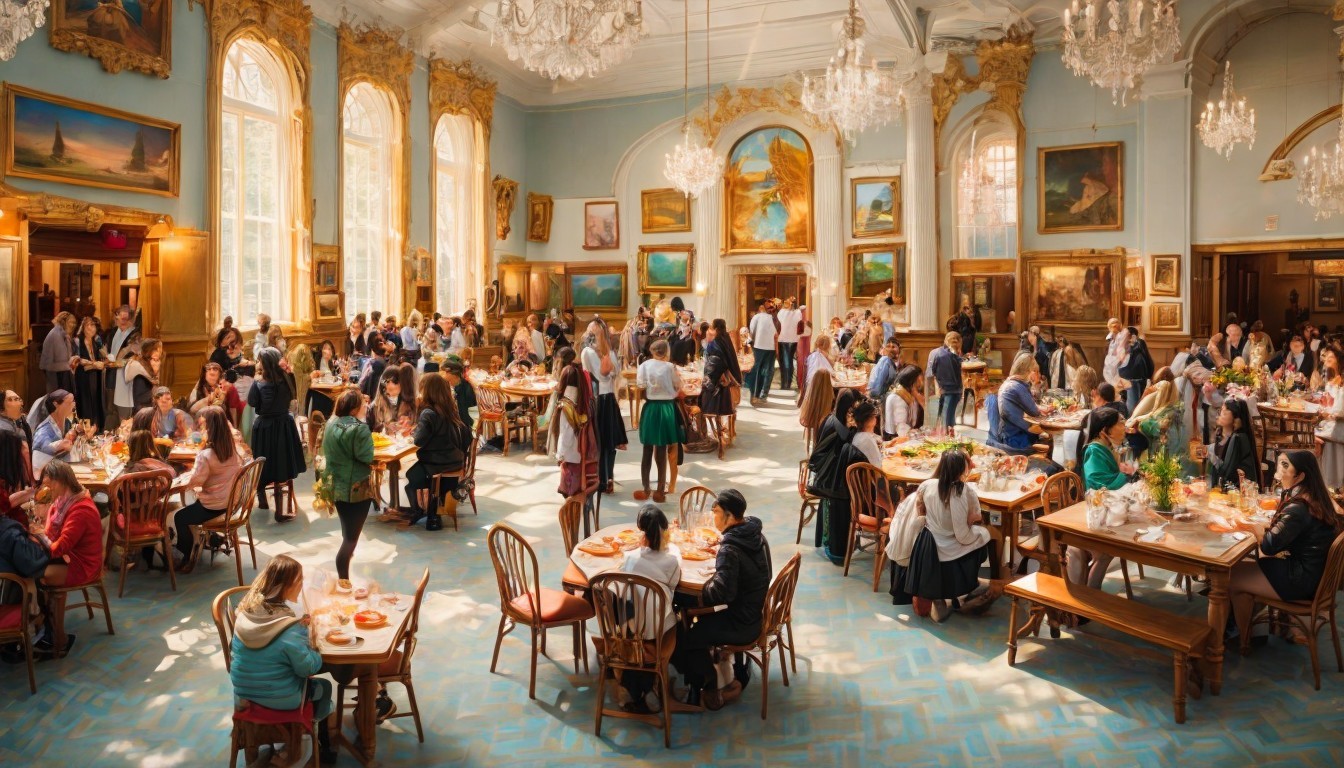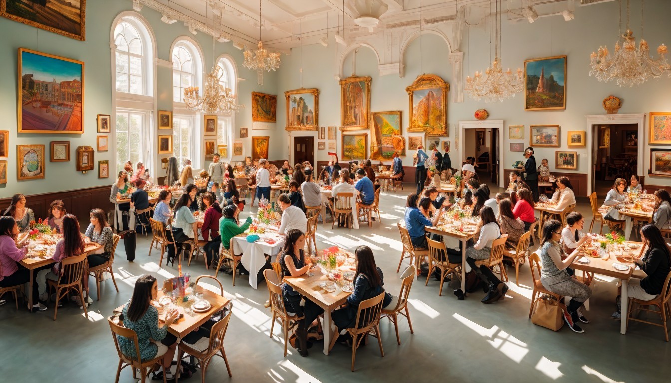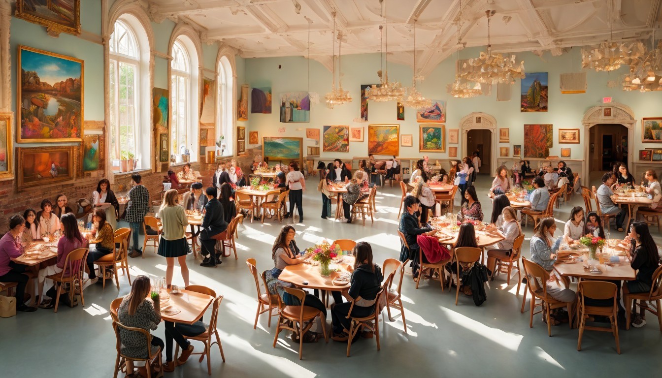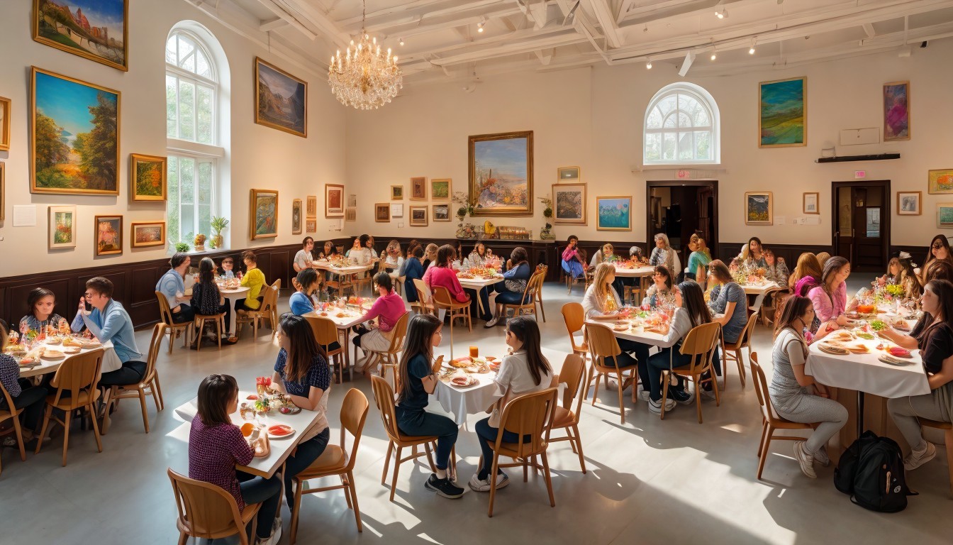 Spacious Dining Hall with Vibrant Decor and Natural Light